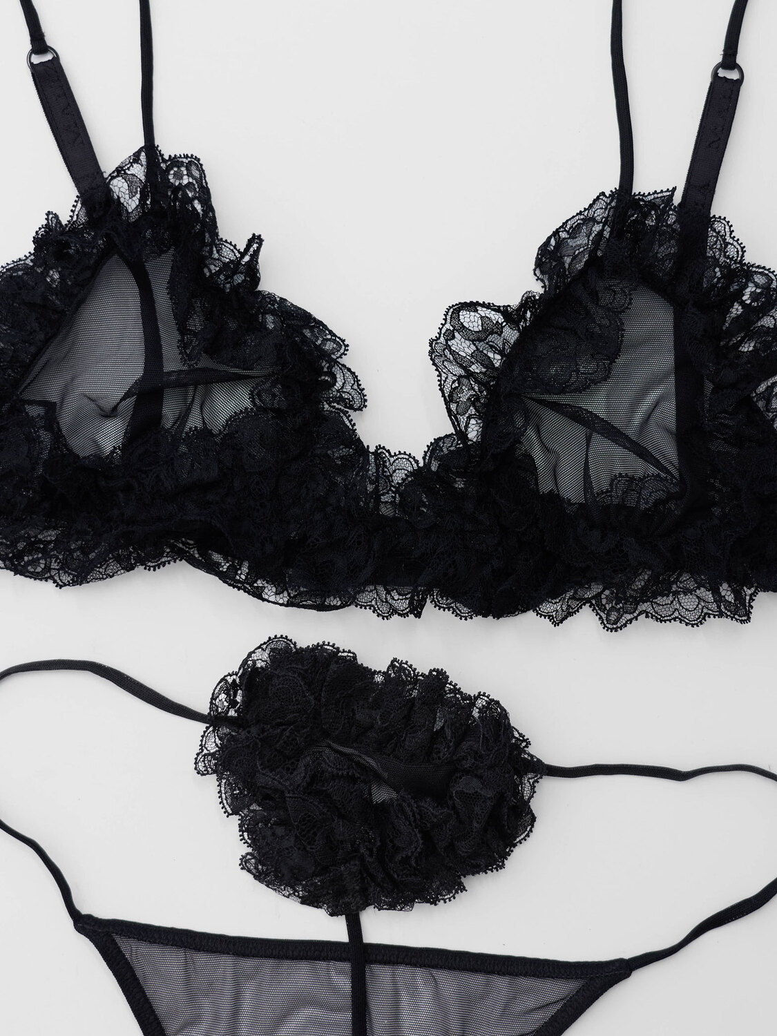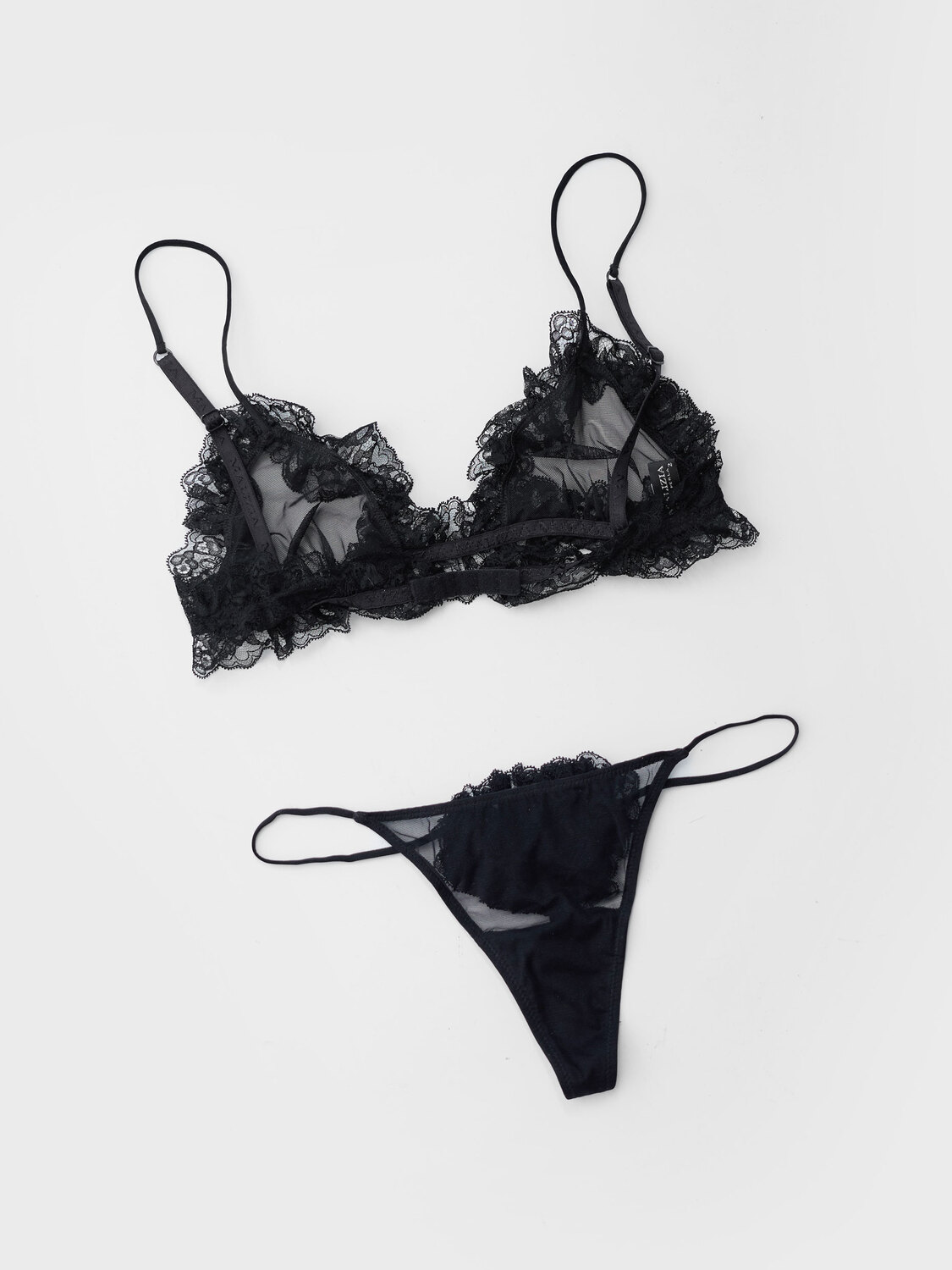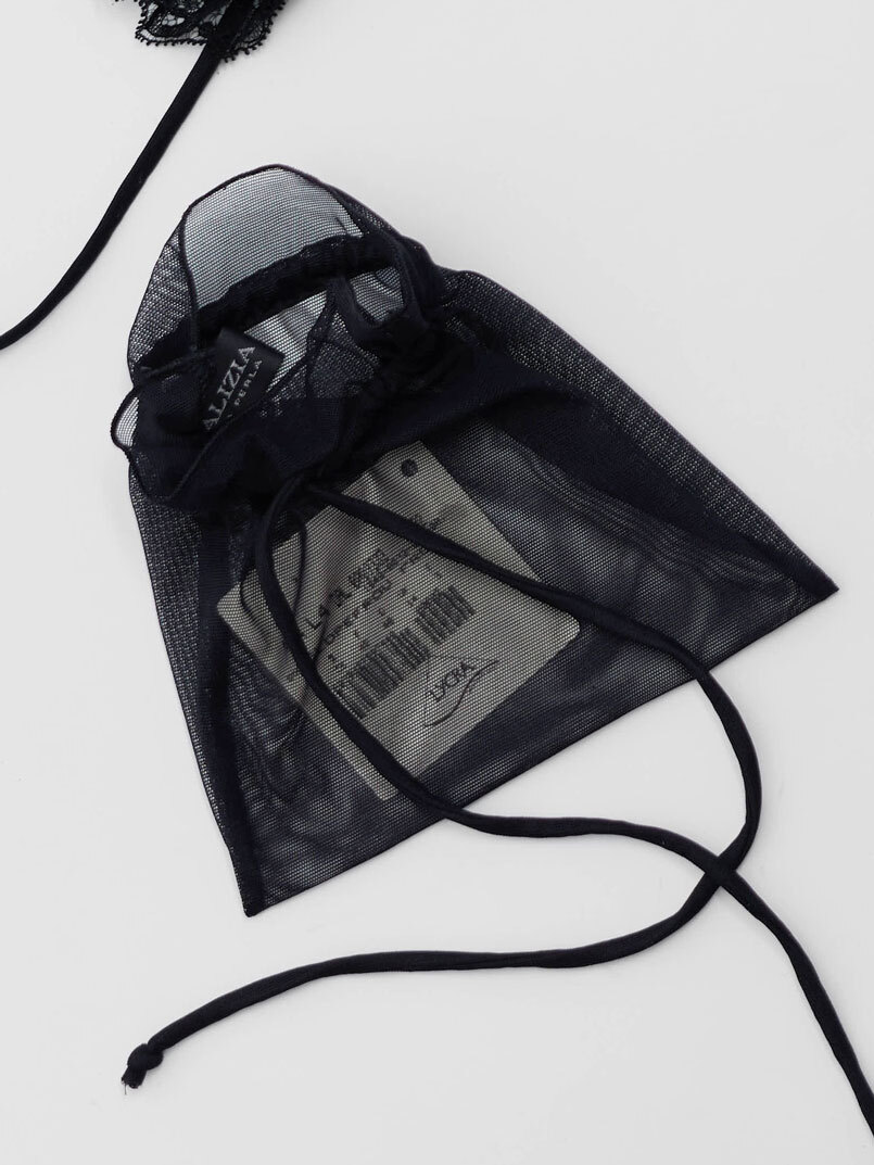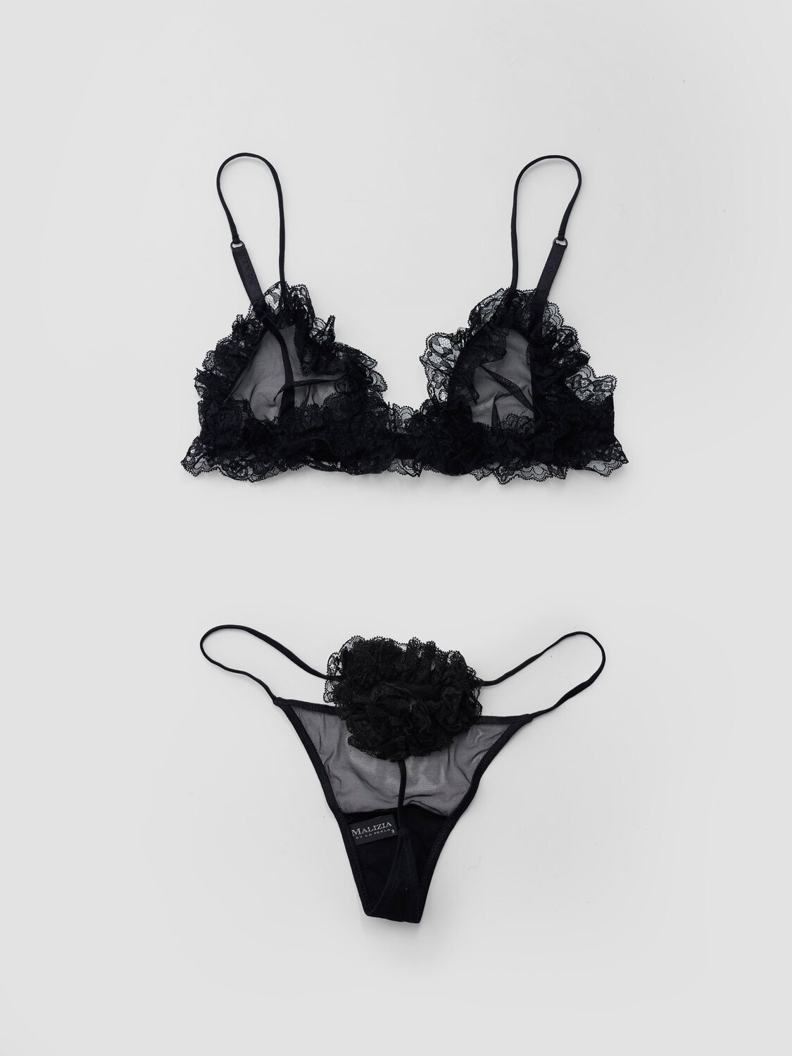 Malizia by La Perla black mesh lingerie set with lace details. String bottoms and a triangle bra.
