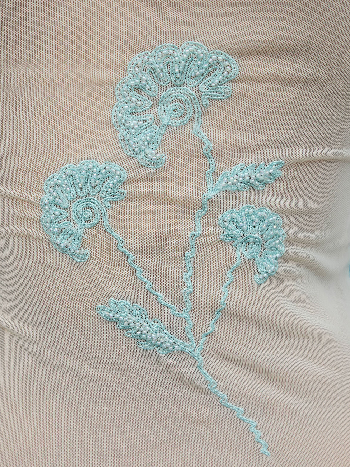 Baby blue rib-knit lurex one-shoulder top with mesh sleeve and mesh back featuring floral embroidery embellished with small pearlescent beads.