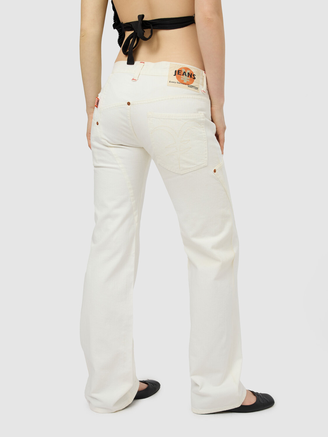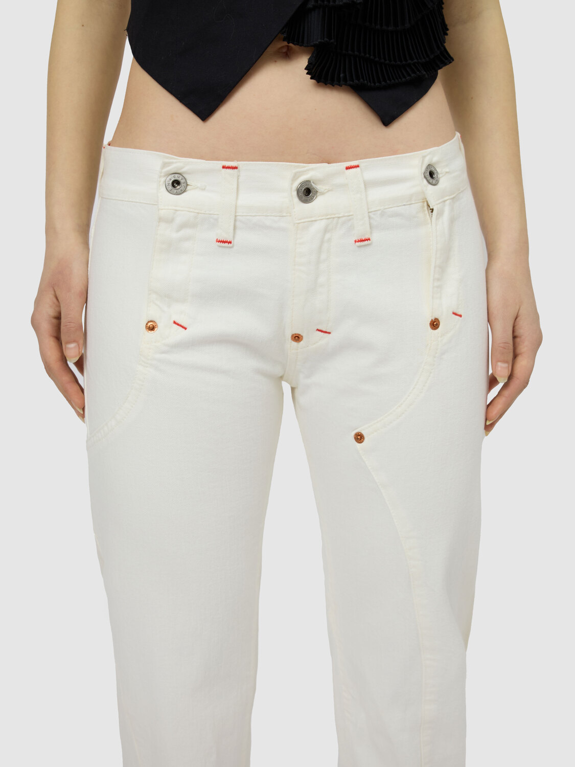 Michiko Koshino white deconstructed jeans. Triple zip and button closure at the front. Logo embroidery on the rear pocket.
