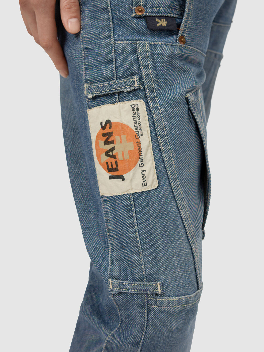 Michiko Koshino deconstructed jeans. Light blue denim. Logo embroidery on the pockets. Adjustable hems.
