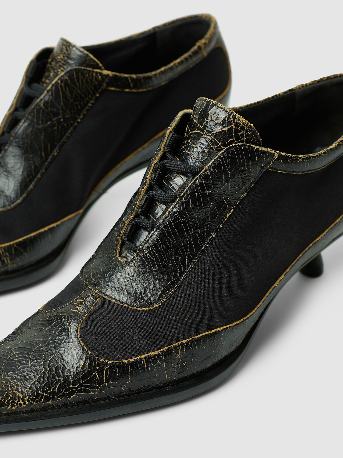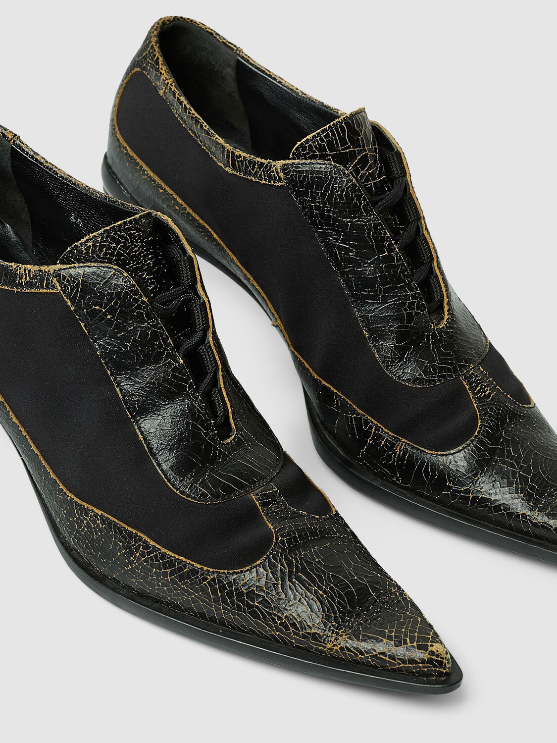 Miu Miu FW 2001 black crackled leather pointed toe spool heels with laces and neoprene sides.