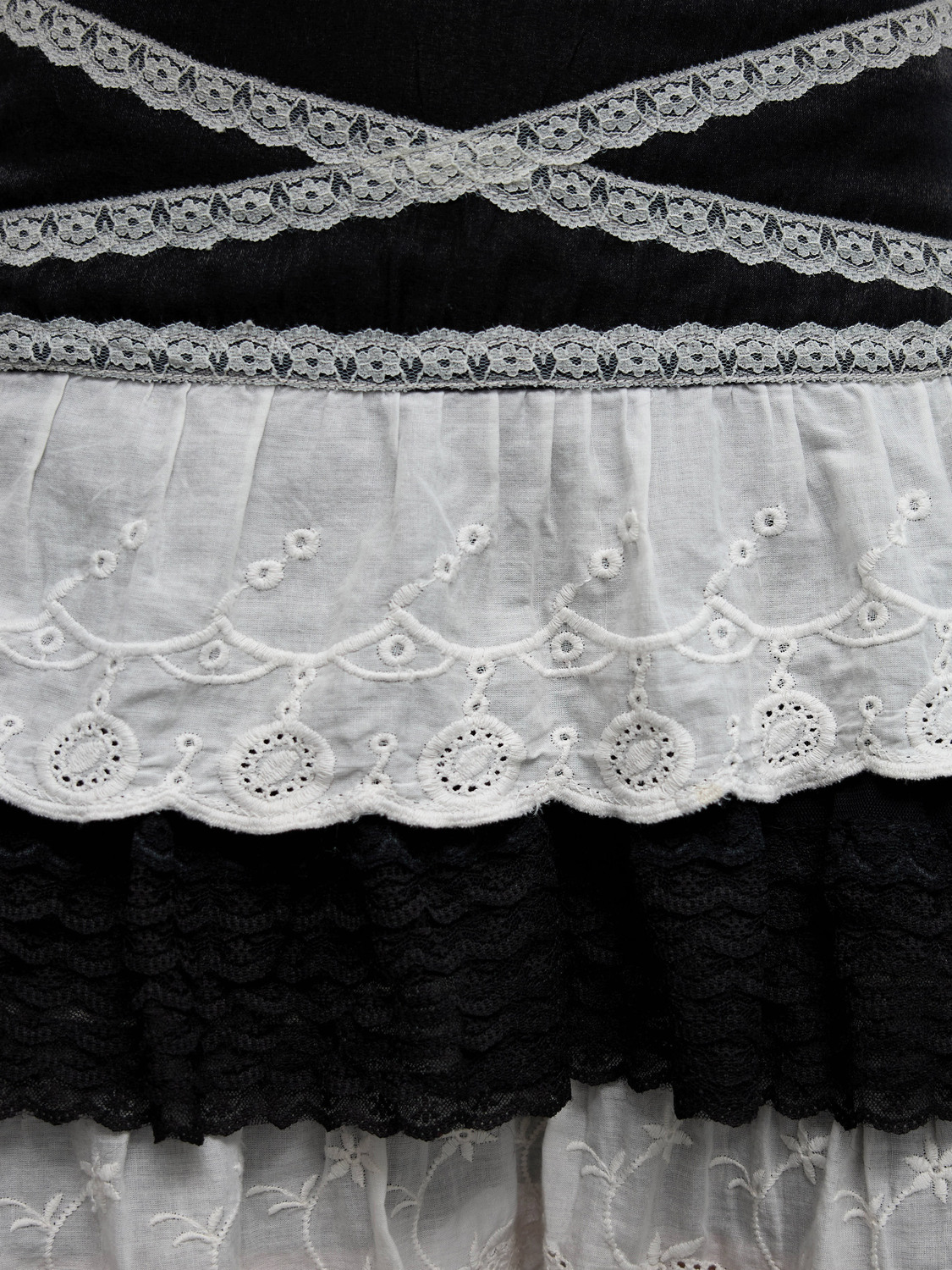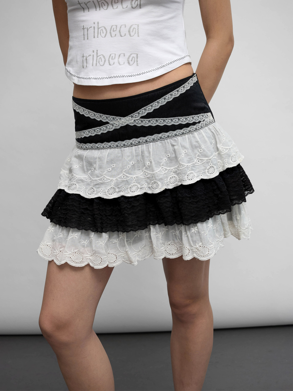 Morgan de Toi black and white layered lace mini skirt. Concealed zipper closure on the side.