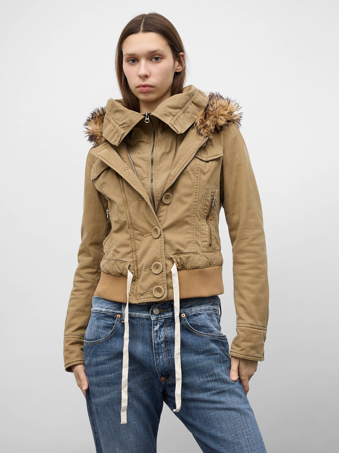 Nolita brown double-layer jacket featuring zip and button closure, faux fur lined hood, brass and silver-tone hardware, integrated drawstrings at the waist.