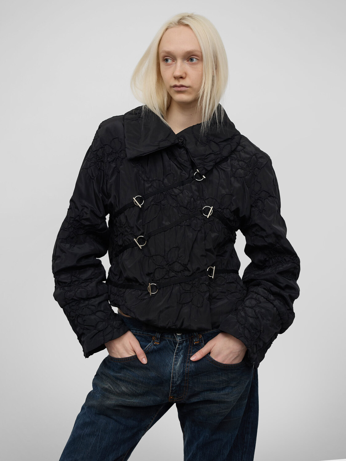 Black nylon lightly padded jacket featuring a button closure, a floral embroidery all over and decorative asymmetrical straps.