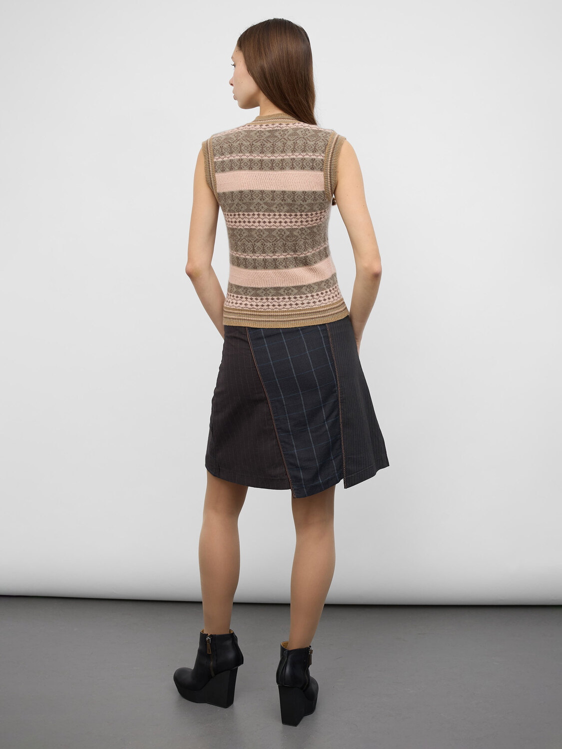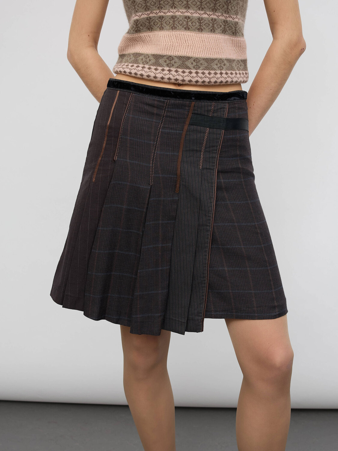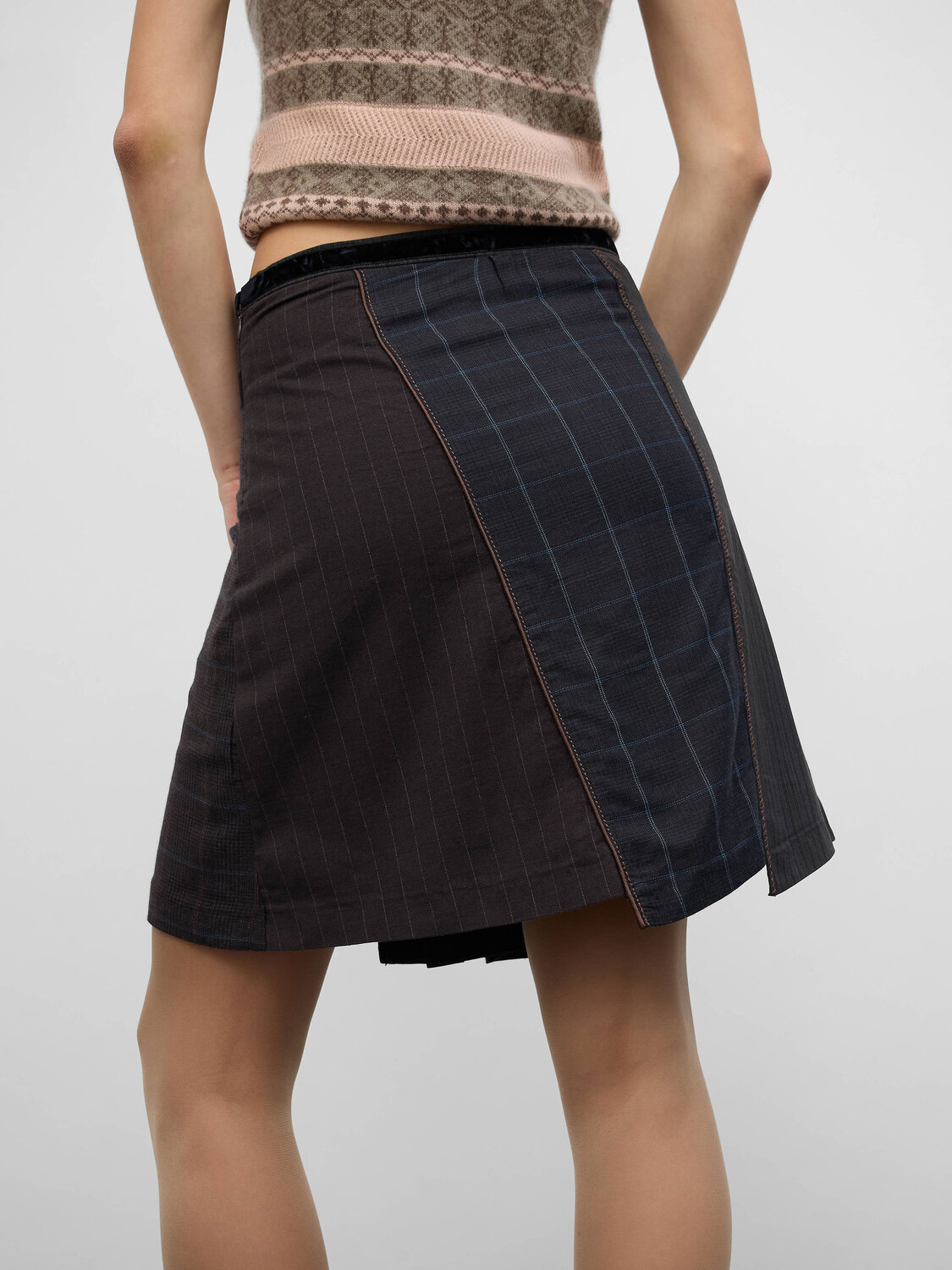 Brown-tone patchwork midi skirt in a variety of suit-style fabrics with black velvet and satin trim. Concealed zipper closure on the side. Satin lining.