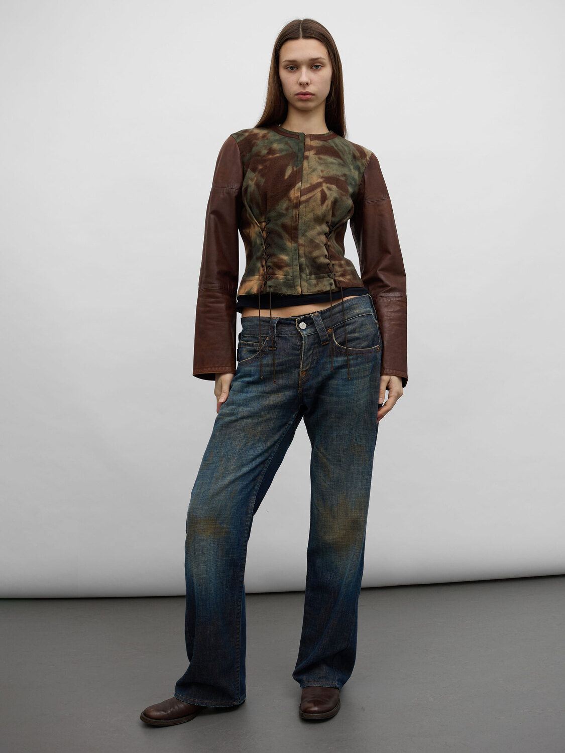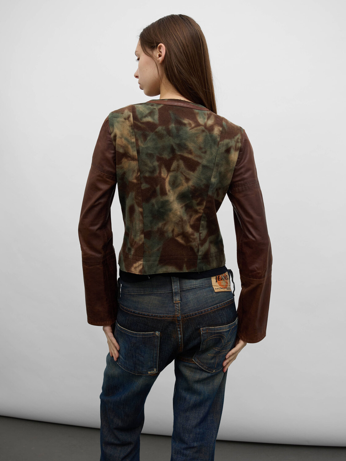 Plein Sud Jeans woodland camo style felt jacket with brown leather sleeves and lace-up detail on the sides. Hook and eye closure.