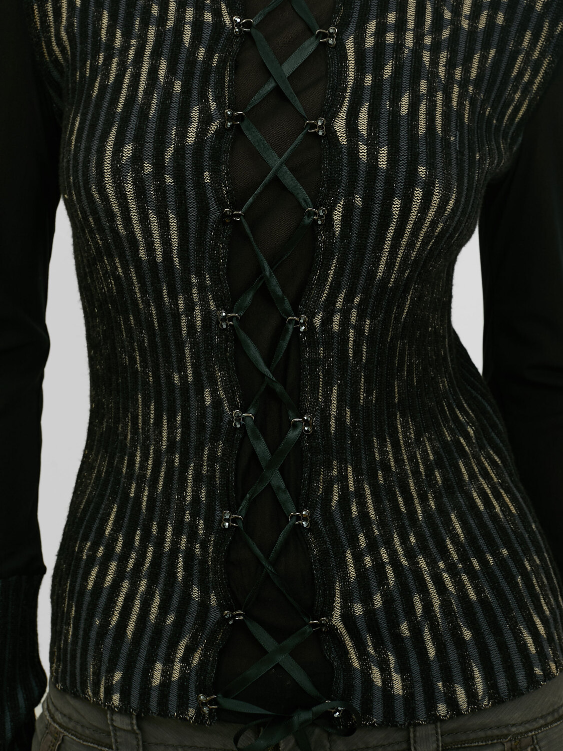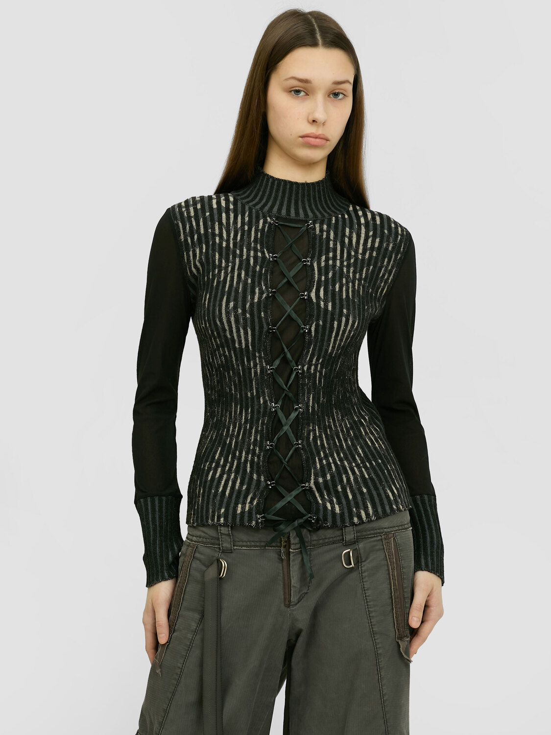 Rib knit turtleneck jumper featuring floral print. Vertical sheer mesh panel at the front. Lace up detail at the front, hooks with rhinestones. Sheer mesh sleeves.