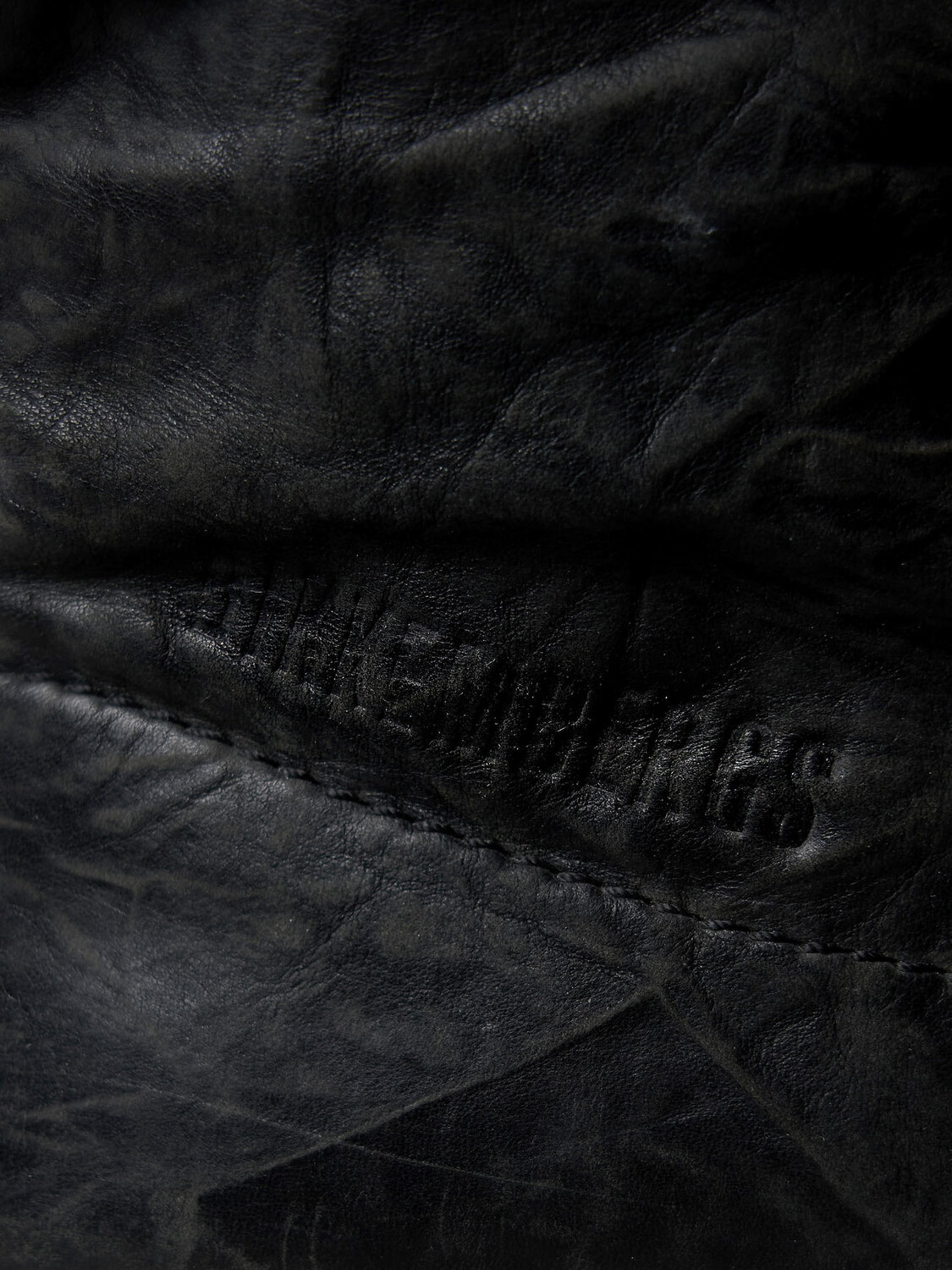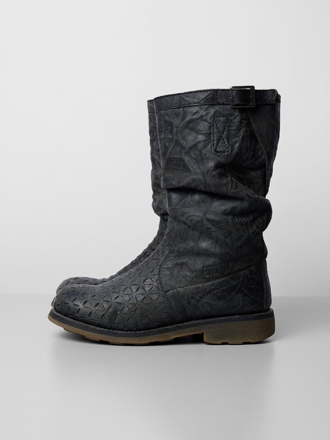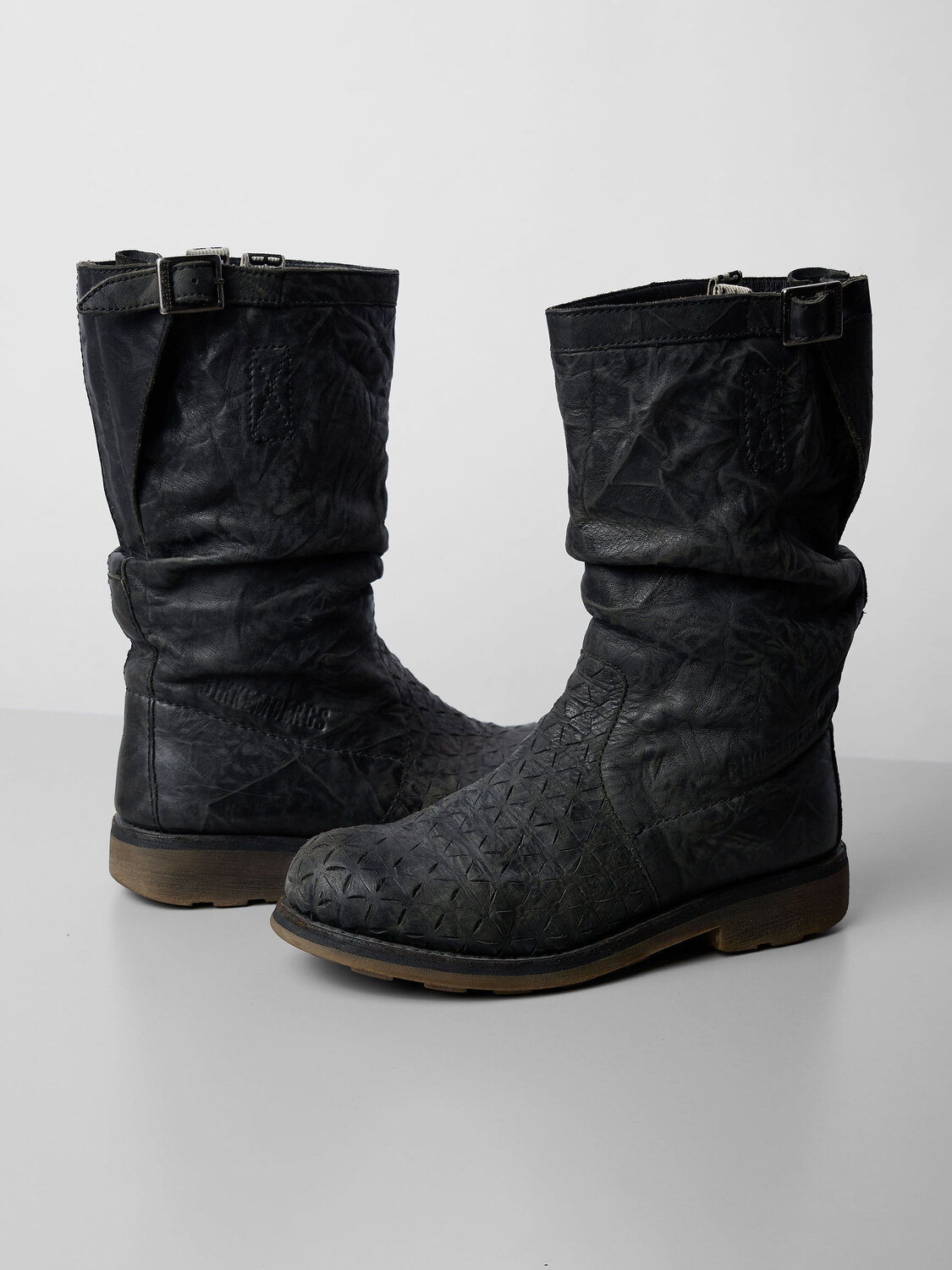 Bikkembergs black distressed and wrinkled effect leather round toe boots. Lazer cut pattern detail. Rubber logo embossed sole.