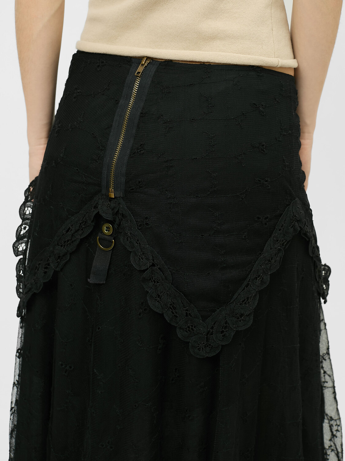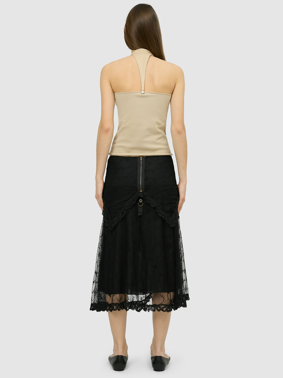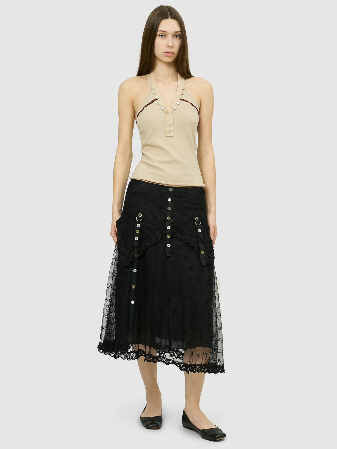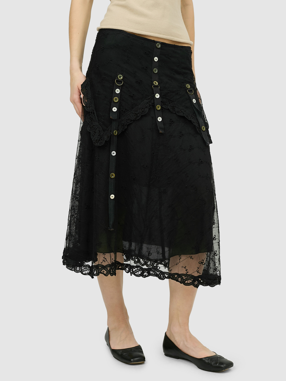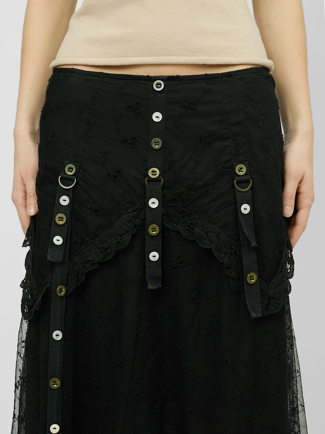 Stefanel black lace midi skirt. Decorative canvas straps with buttons. Light cotton lining. Zipper at the back.