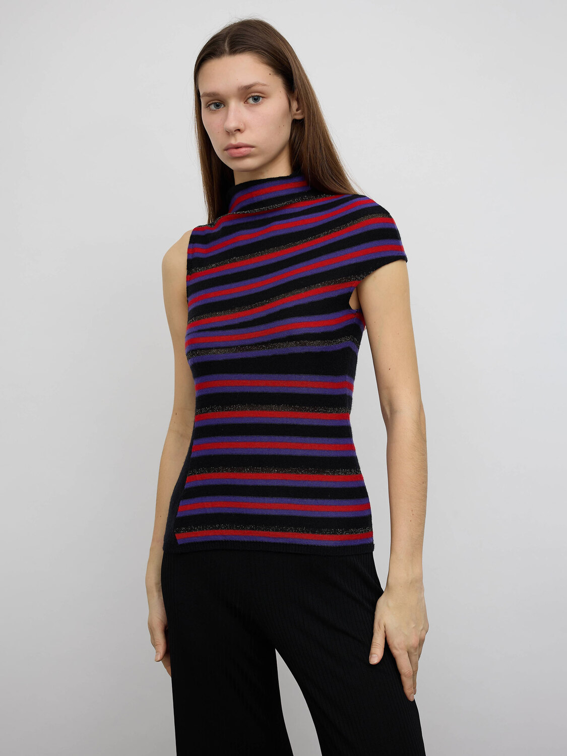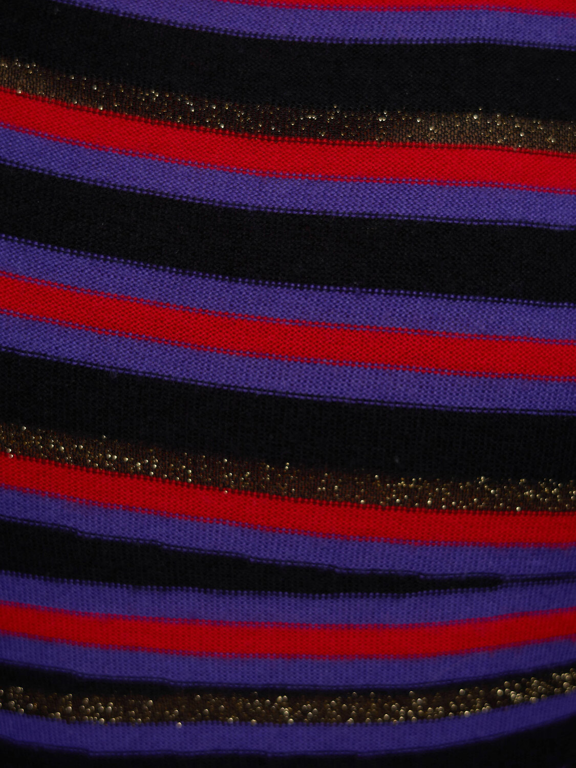 Black, purple and red striped merino wool knitted asymmetrical sleeveless top. Glittery gold accents.