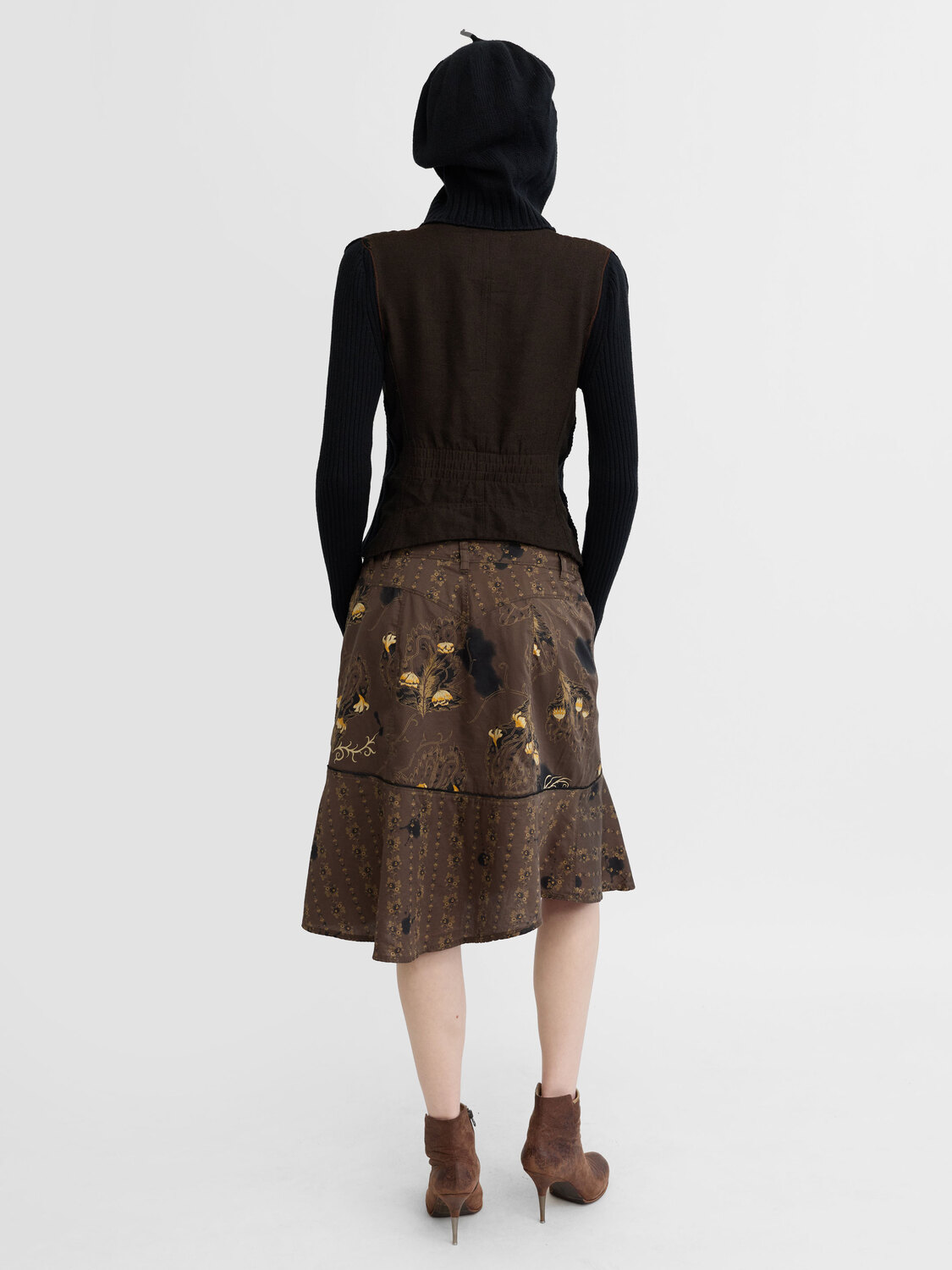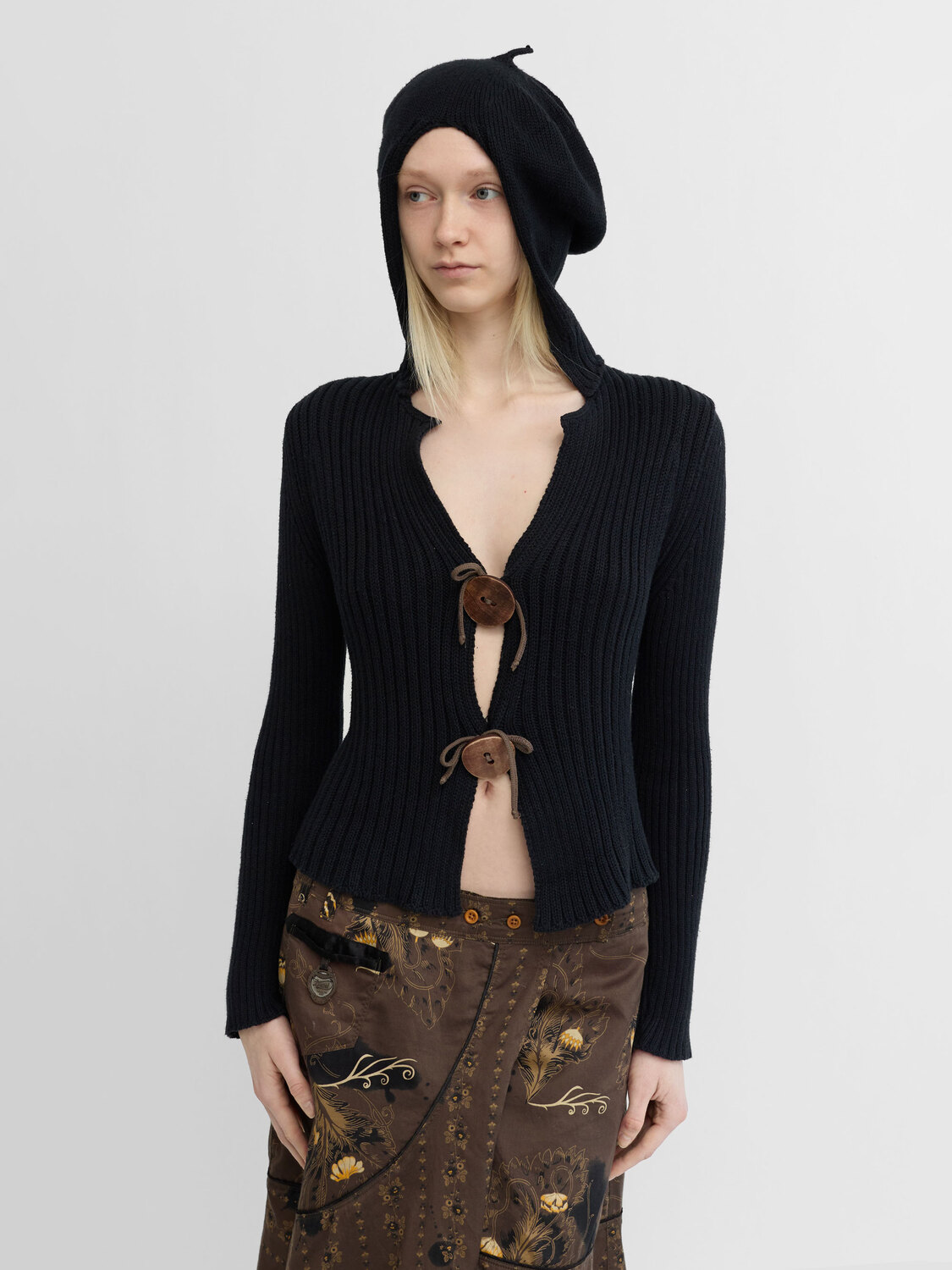 Cop Copine grey and black button-up cardigan with knitted sleeves and an integrated beret hat. Logo embroideries at the front and the rear.