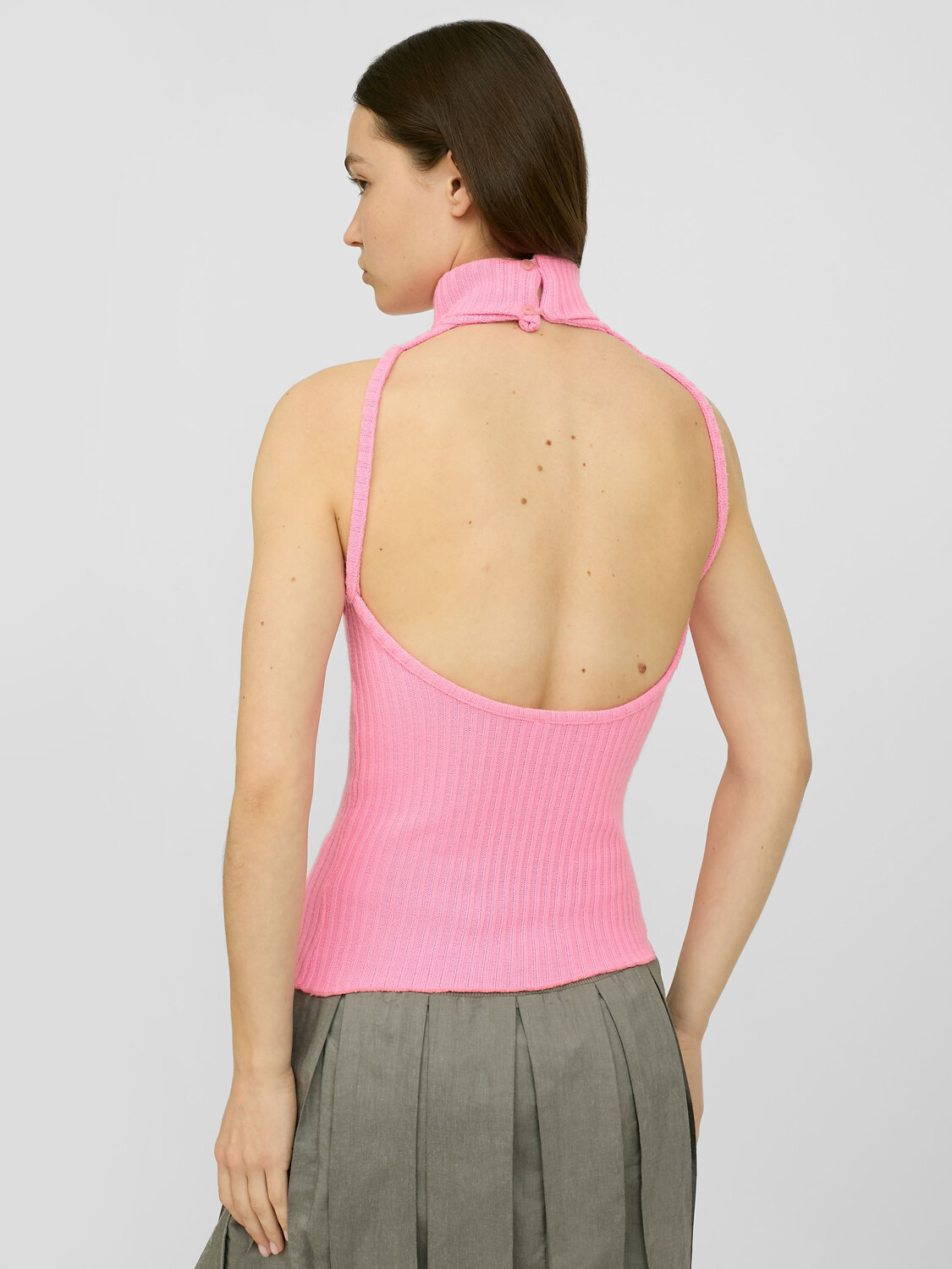 Morgan de Toi bubblegum pink rib-knit open back sleeveless turtleneck top.
