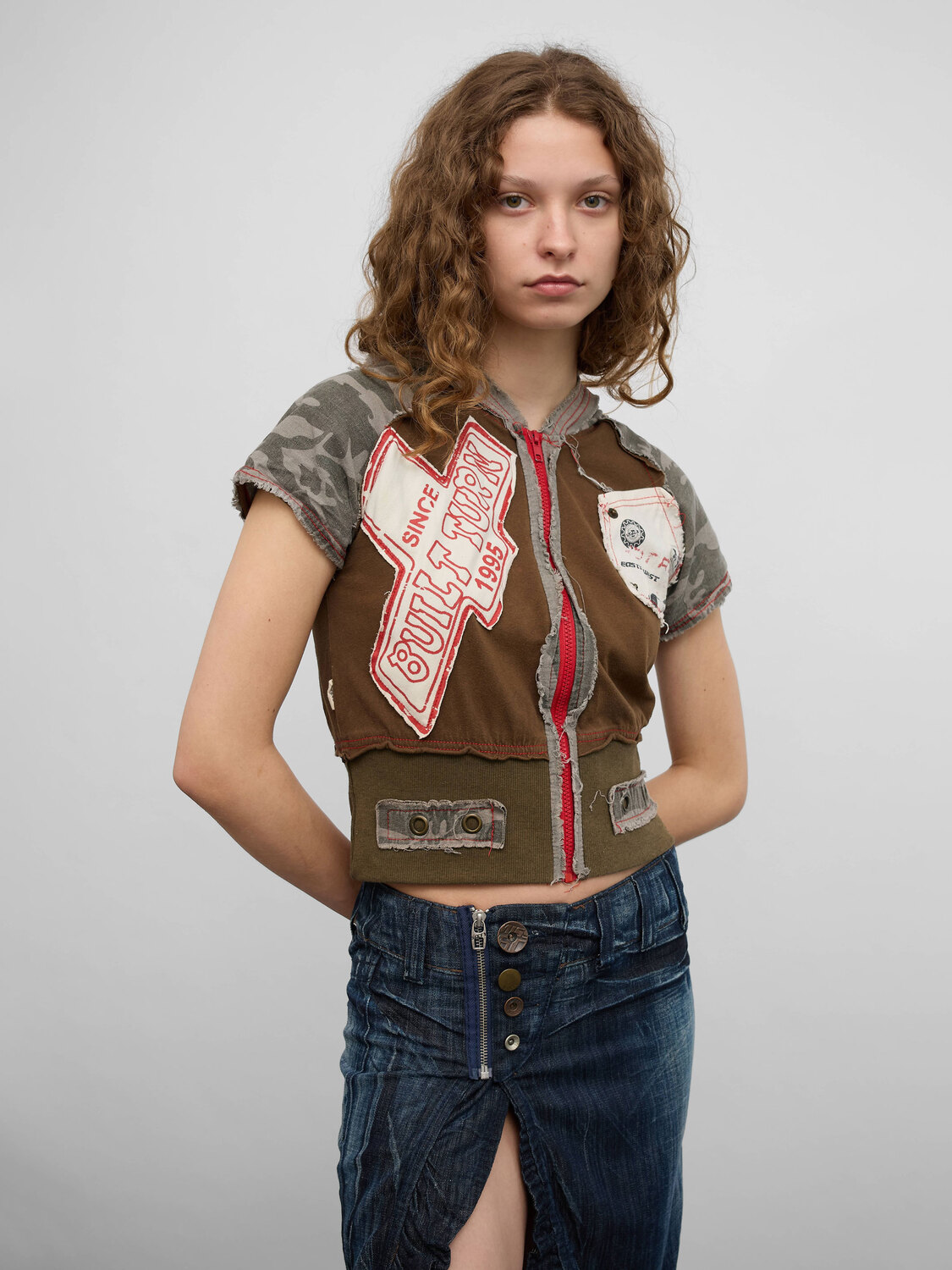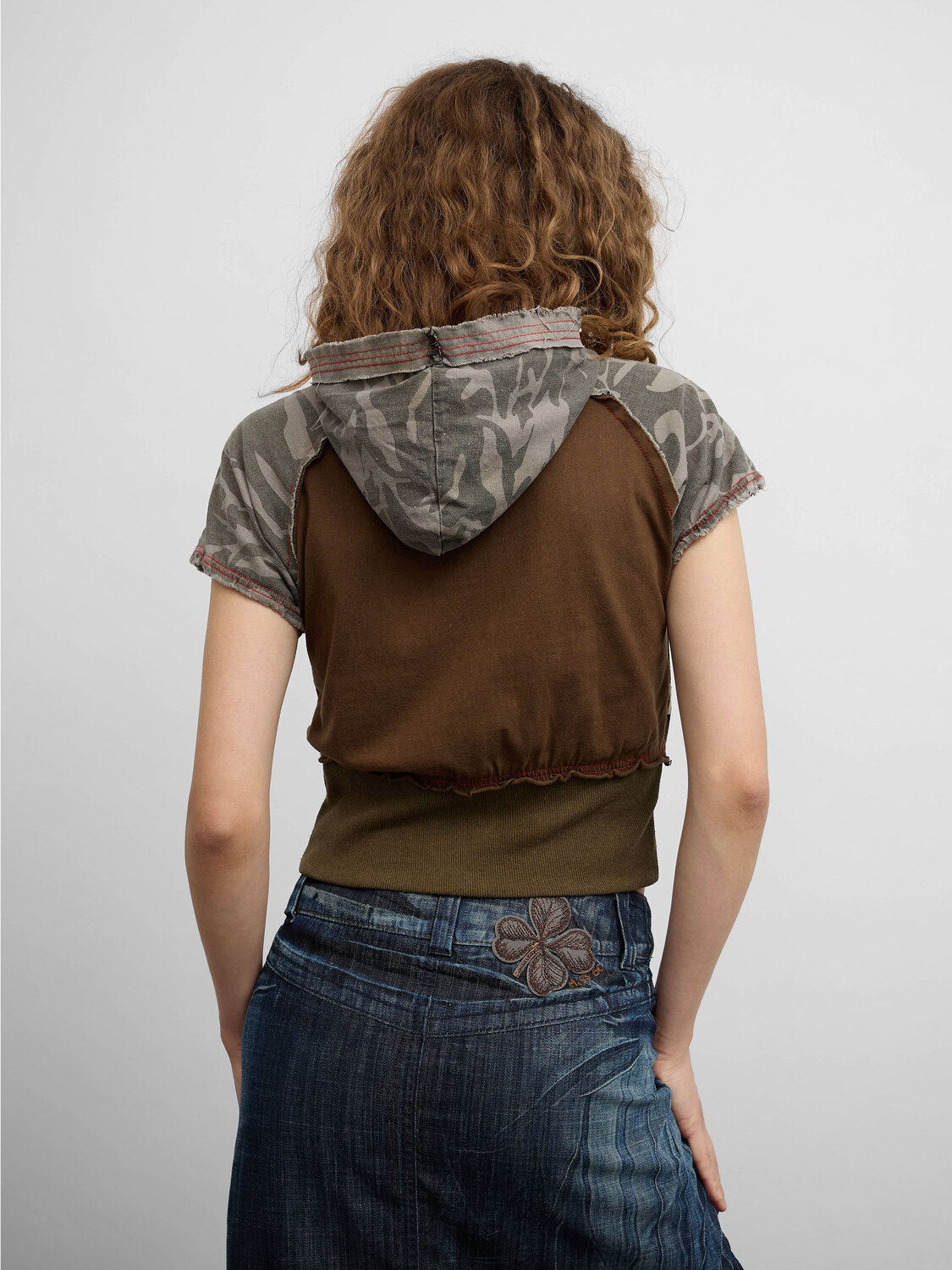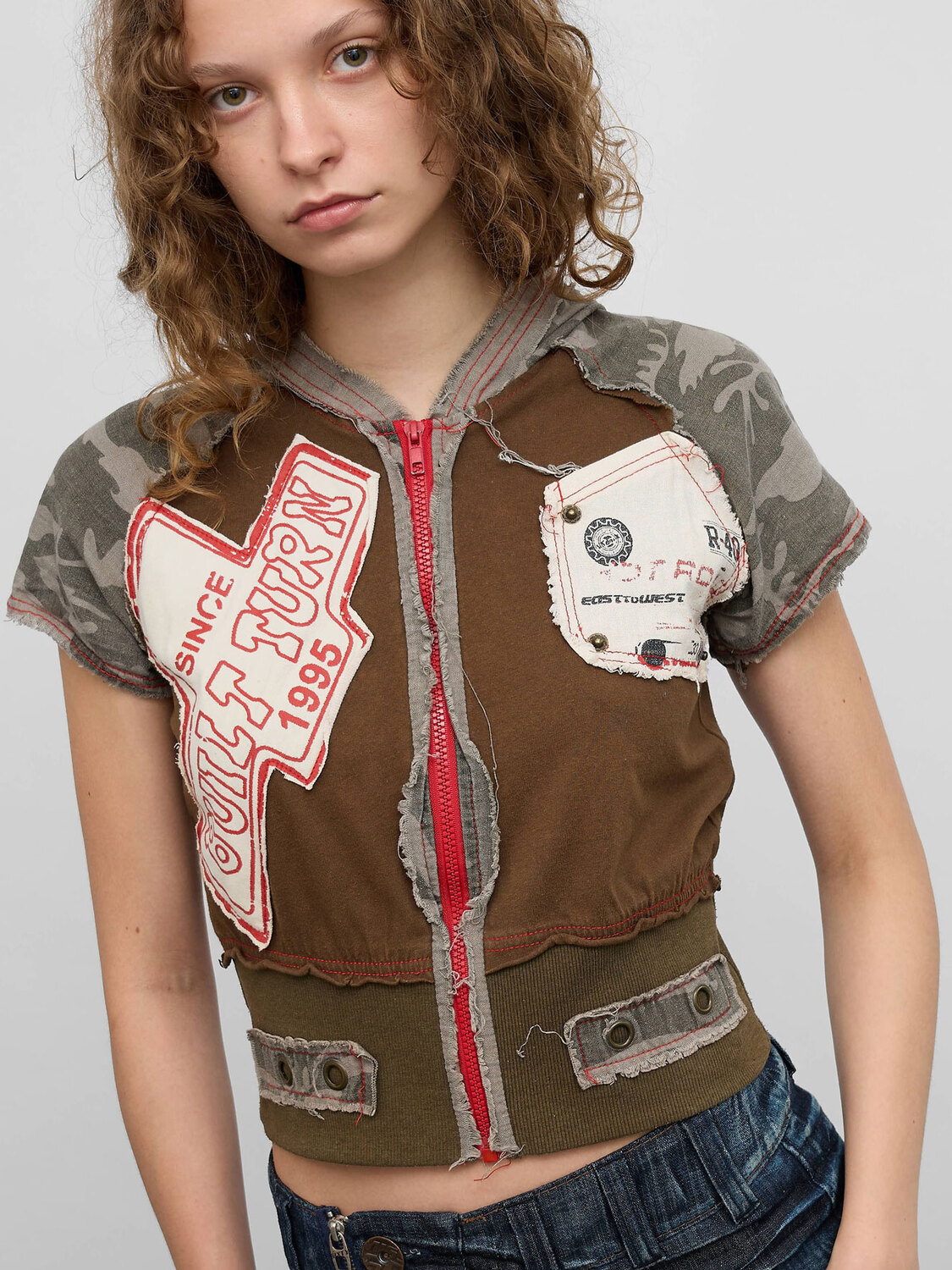 Brown khaki and grey camo patchwork short-sleeve hoodie. Decorative patches. Zipper closure.