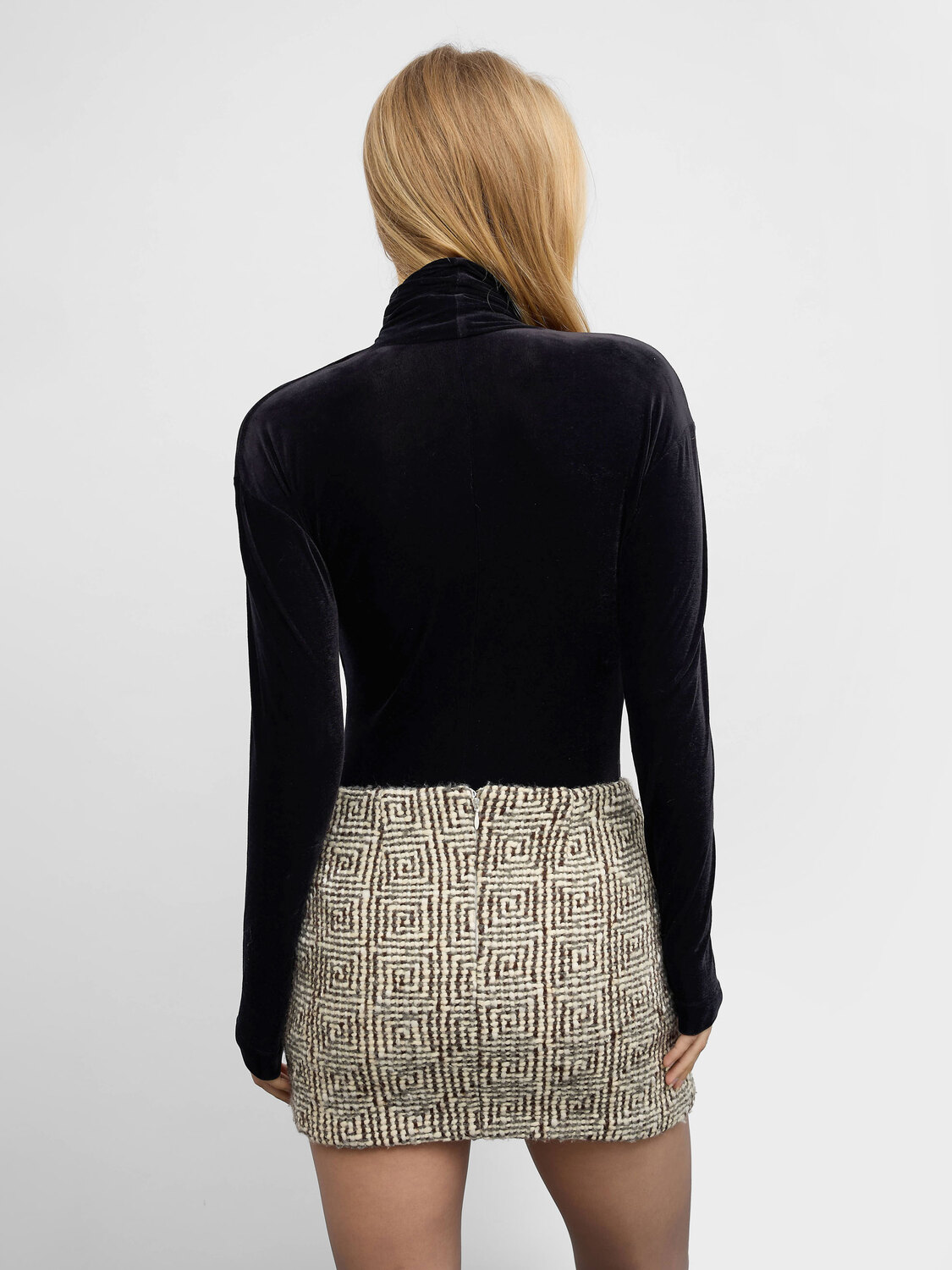 Plein Sud black stretchy velvet mock-neck blouse with gathered details.