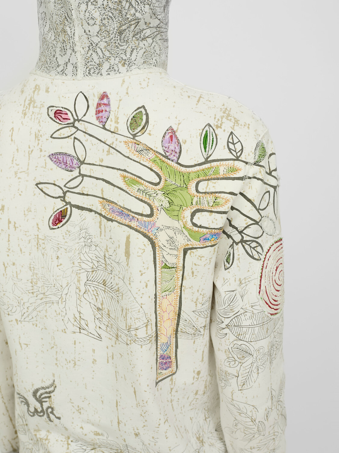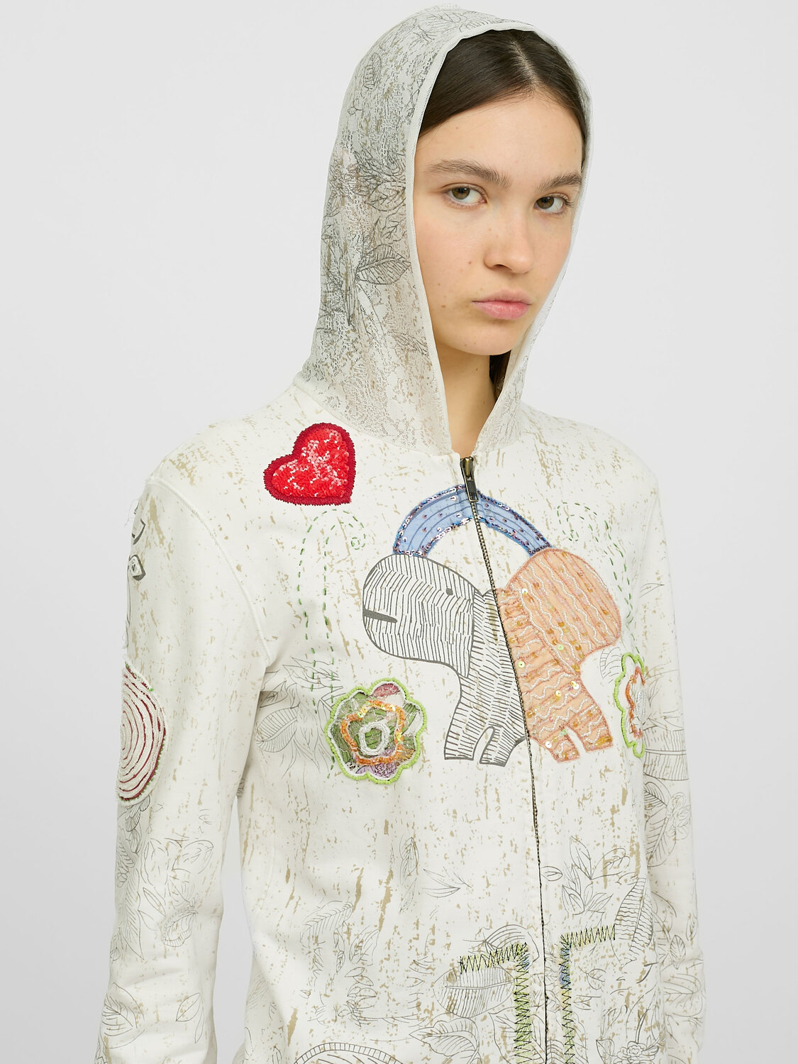 We Are Replay white zip-up hoodie featuring a playful graphic print and lace hood. Embellished with various sequins, beads and appliqués.