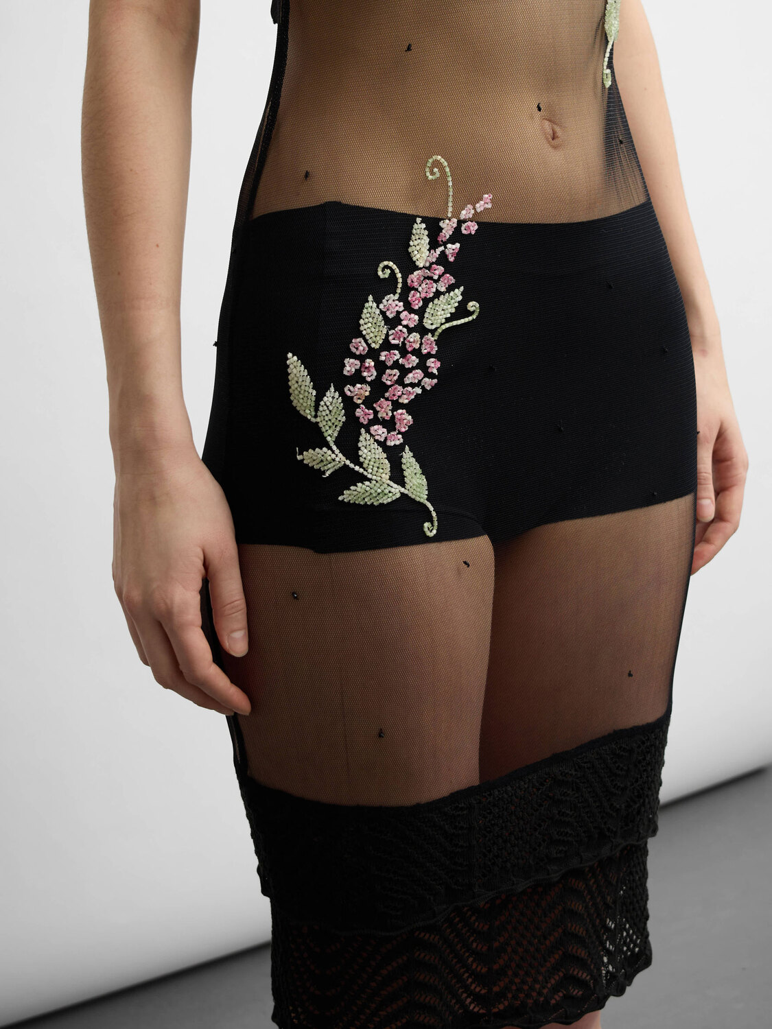 AA Milano (by Alessandro Dell'Acqua) black mesh camisole mini dress with pale pink and green floral bead embellishments and a layered knitted lace hem.