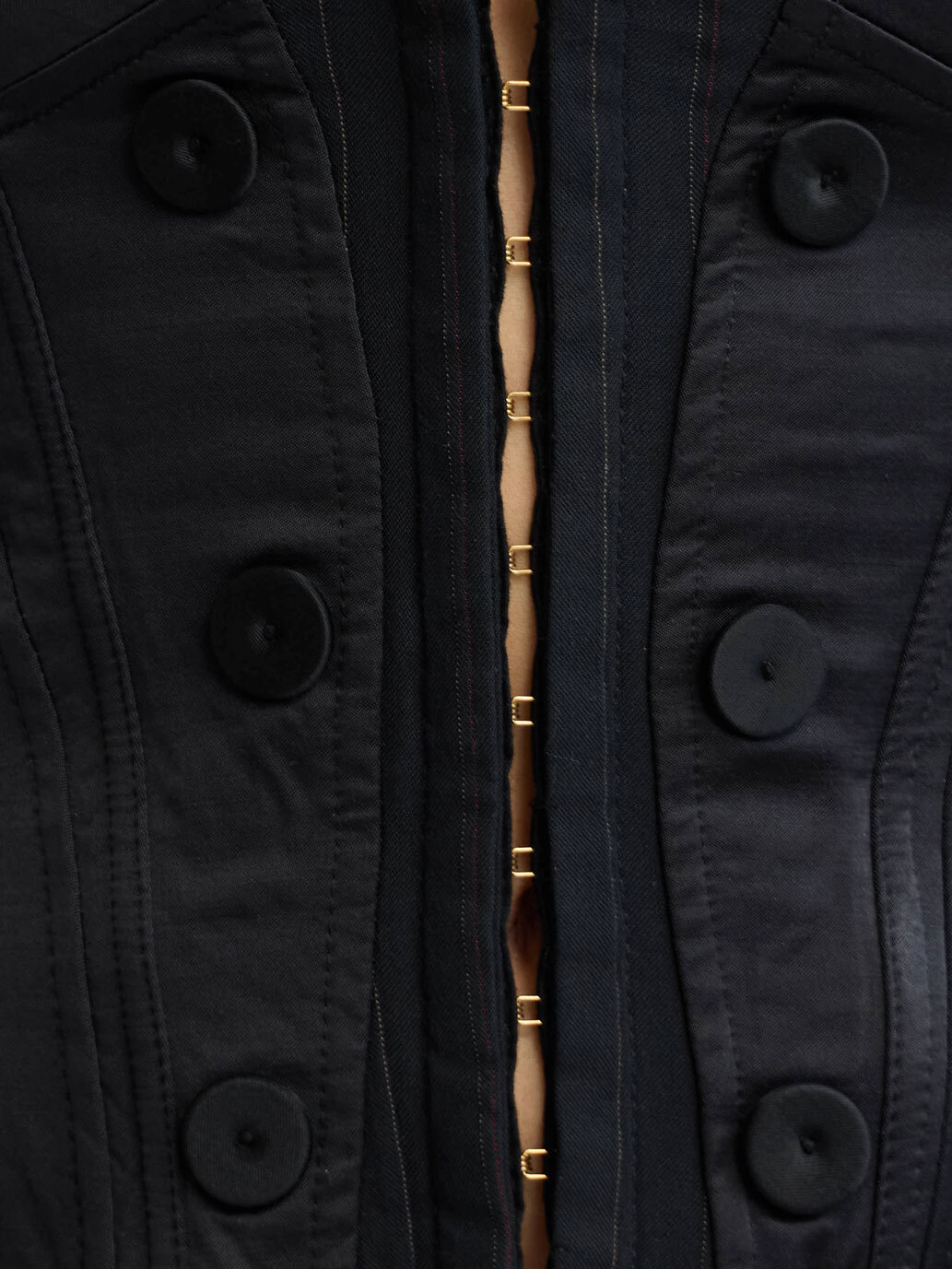 Black striped deconstructed blazer with an integrated corset. Lace-up back. Hook and eye closure.