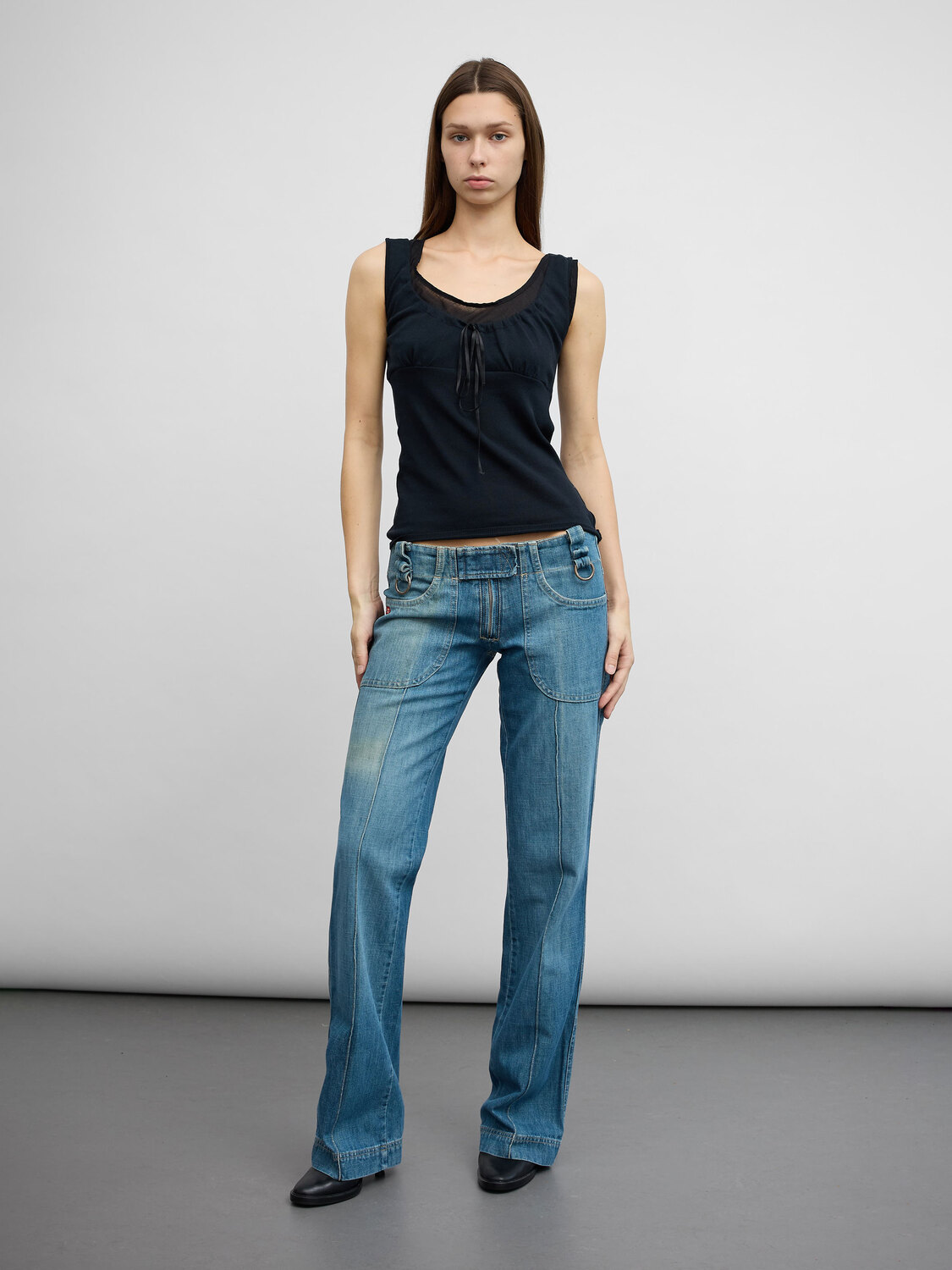 Black knitted milkmaid vest with an integrated light cotton internal layer and a gathered detail with ties.