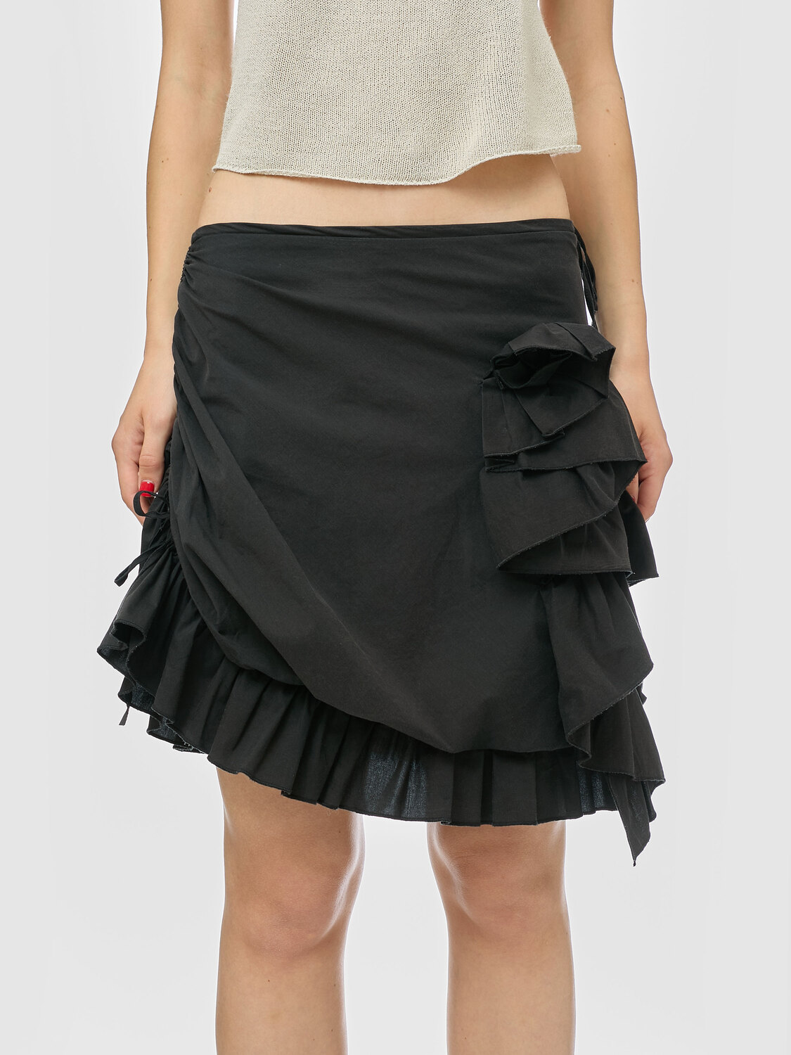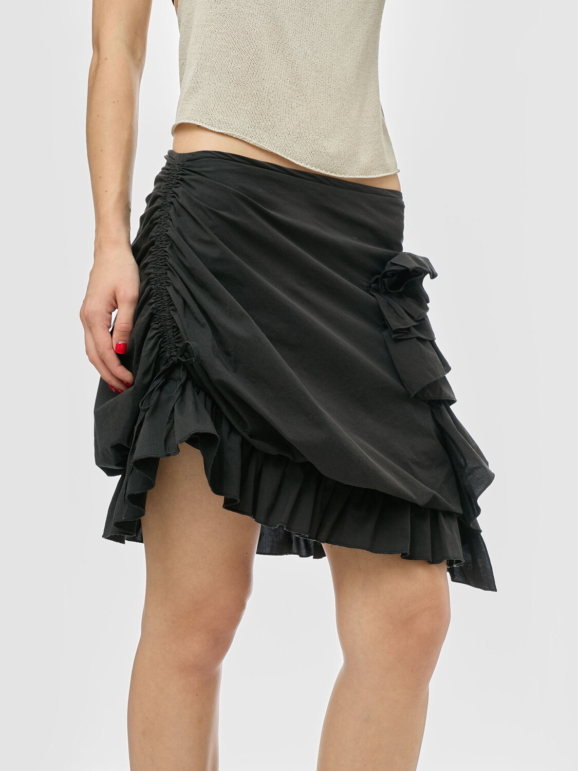 Cop Copine black stretchy mini skirt with gathered details and ties for adjustment. Pleated hem. Concealed zipper closure on the side.