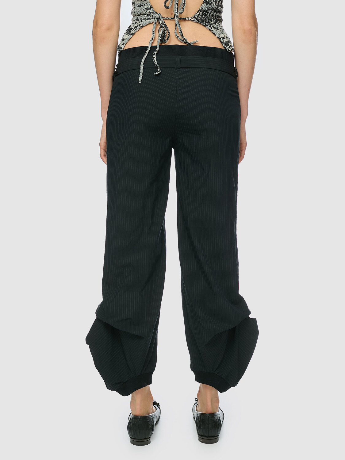 Cop Copine black pinstripe trousers with folded an integrated belt, rib knit waistband and cuffs