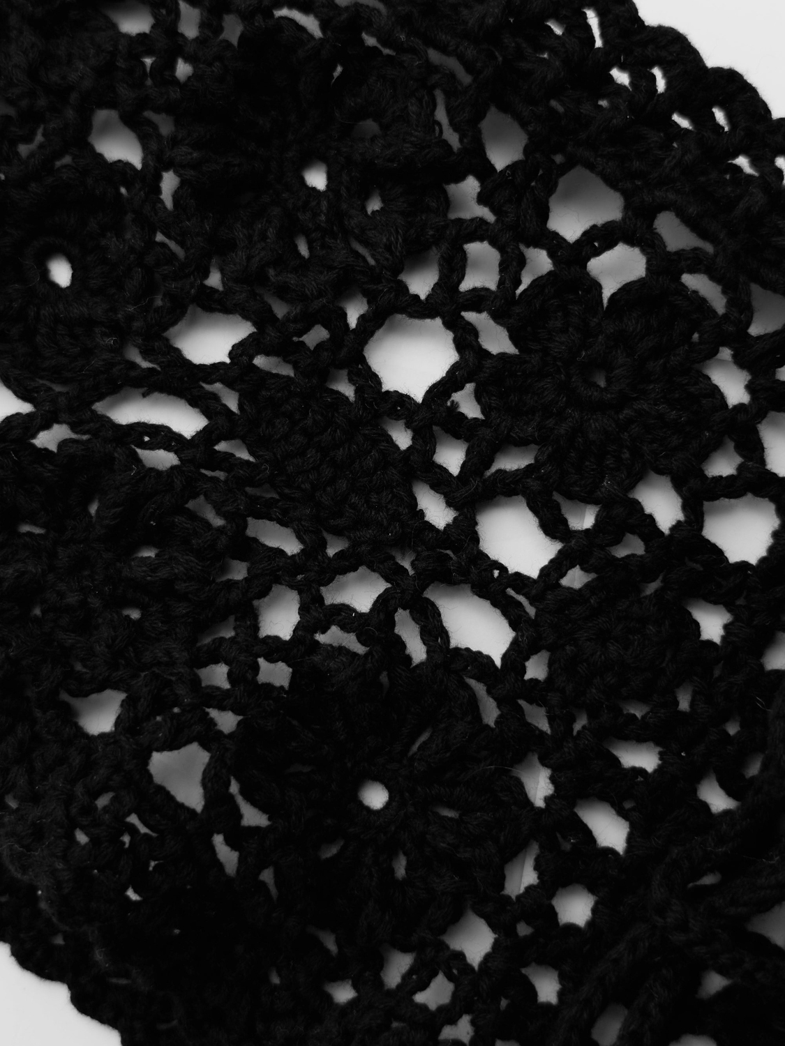 Pain De Sucre black crochet bikini set. Triangle lined halter bra. Open knit low rise shorts with drawstrings. French 90's brand.