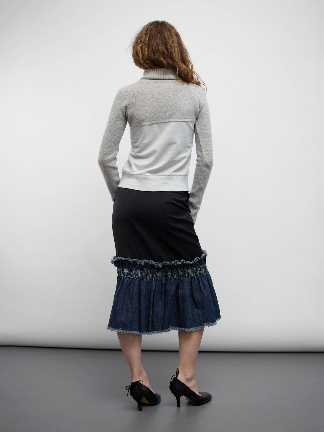 Diesel light grey deconstructed jumper. Knit turtleneck upper part with zip-up sweatshirt bottom. Logo print and small emblem appliqué at the front.