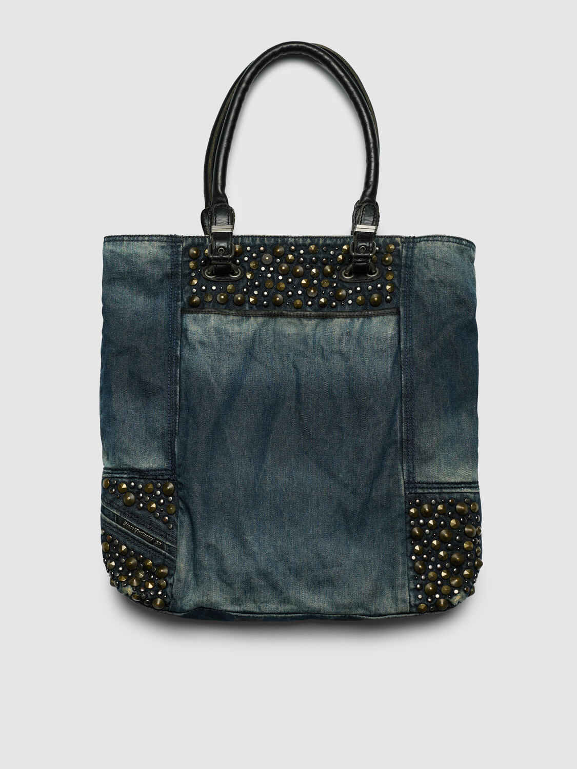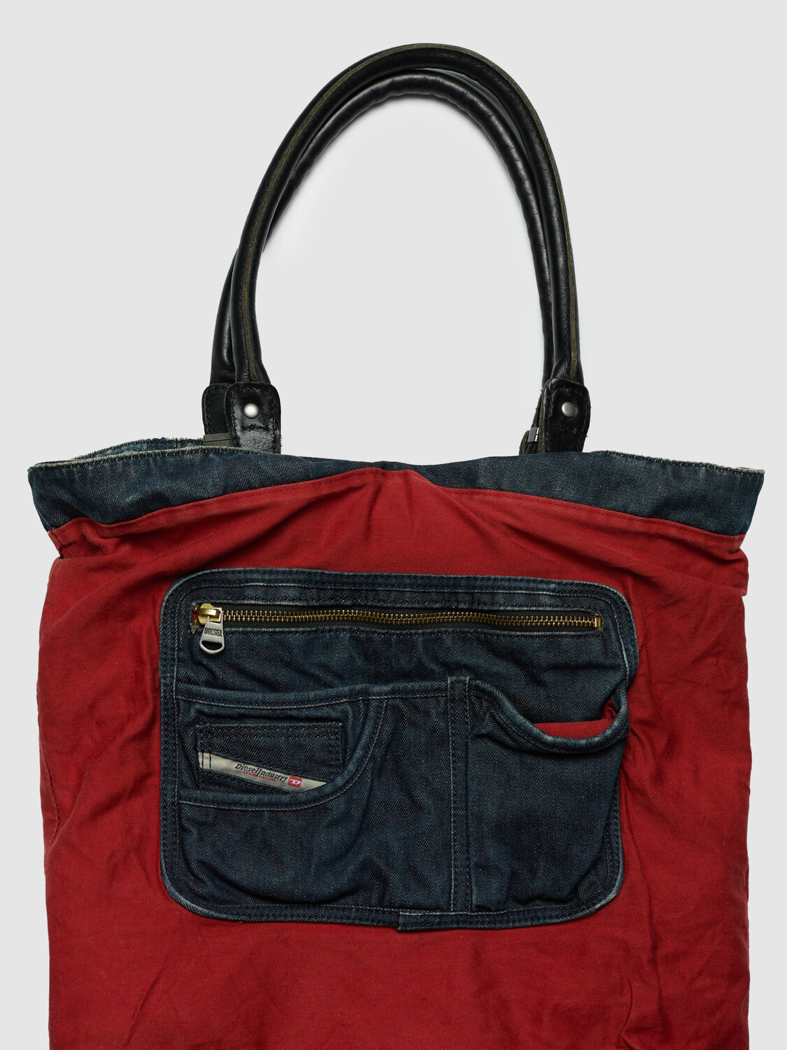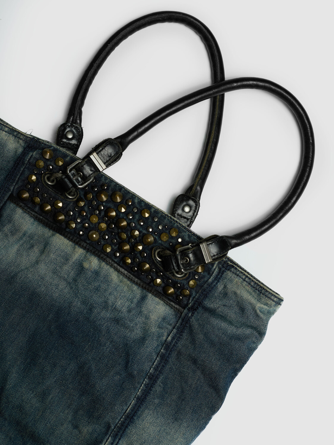 Diesel deconstructed distressed denim handbag with decorative brass-tone metal rivets and studs. Black leather handles. Brick red canvas lining. Multiple internal jeans style pockets. Magnetic snap button closure. Can be worn inside out.