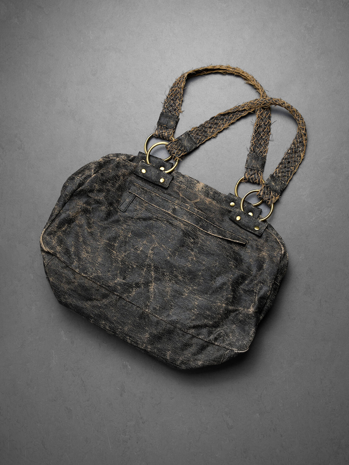 Grey and beige coated canvas distressed handbag with braided handles. Brass-tone metal hardware. Sequin and bead embellished macrame patches. Peach jacquard satin lining.