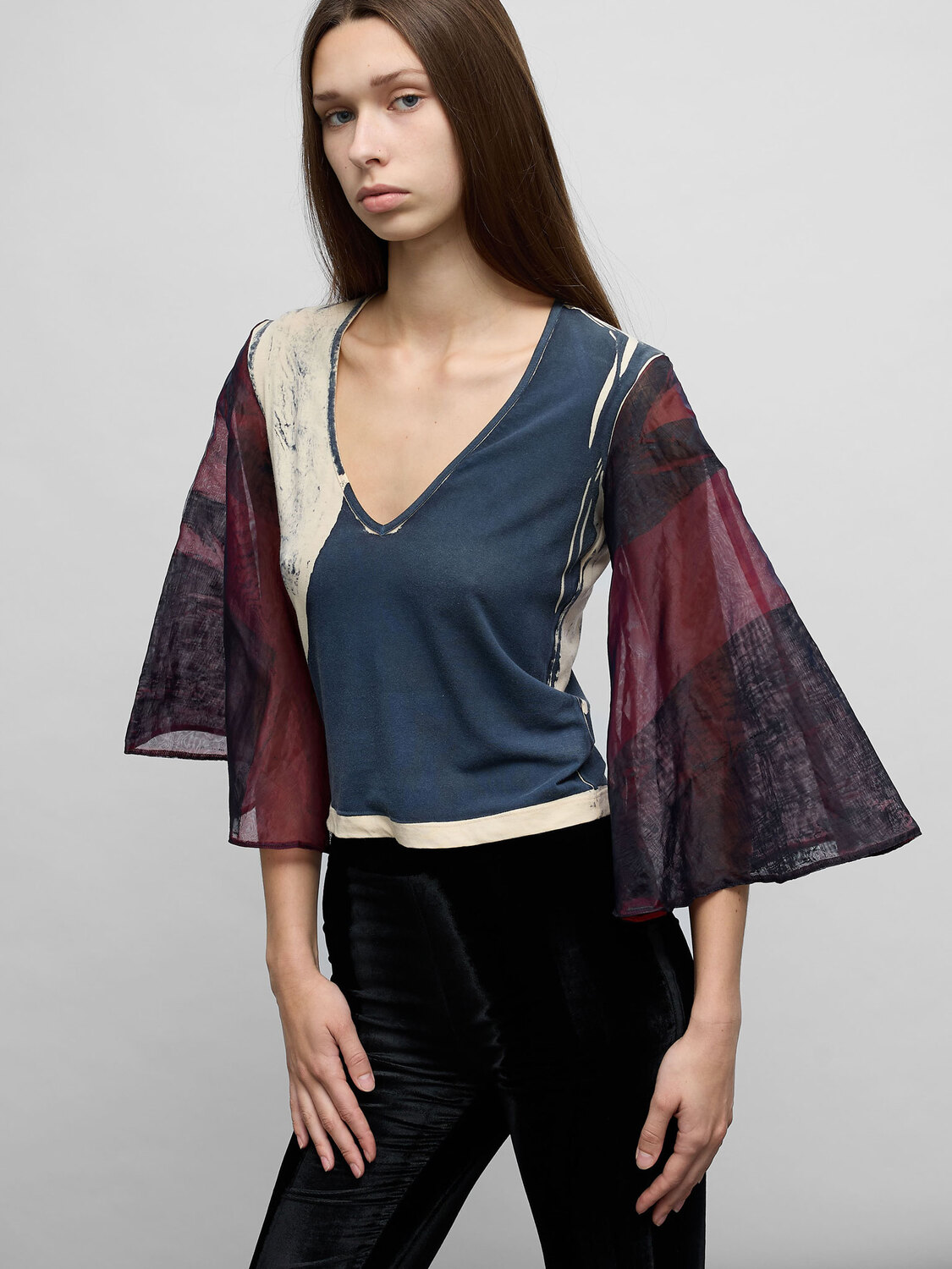 E-play blue and cream abstract print top with bell sleeves made of layered iridescent blue and red organza.