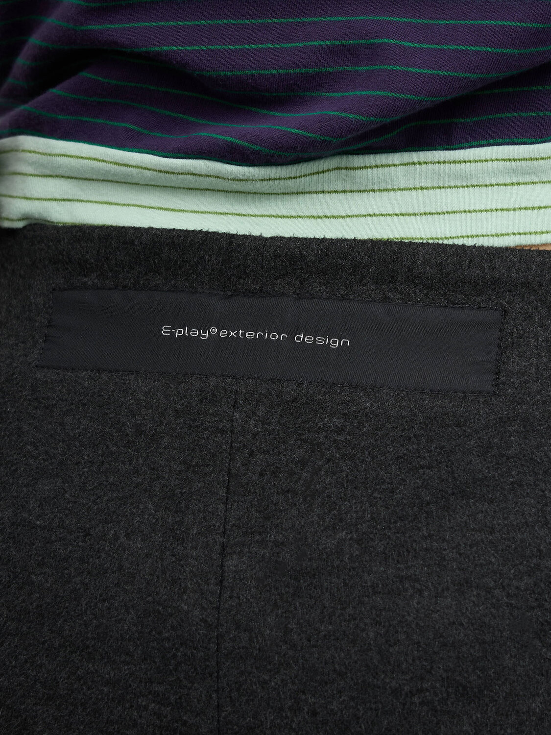 E-Play grey stretchy midi skirt with a navy blue front and flap zipper pocket. Zipper closure on a side.