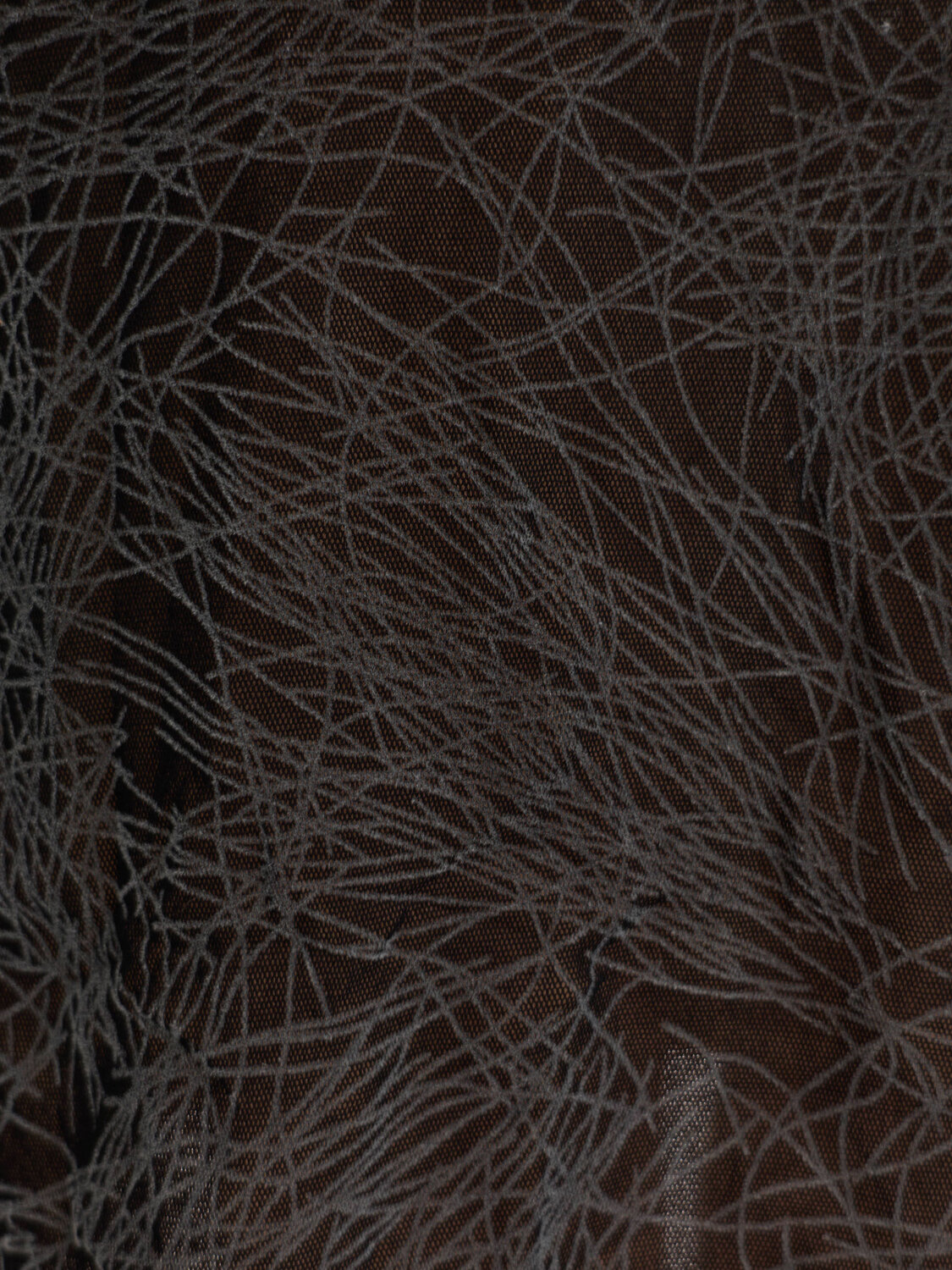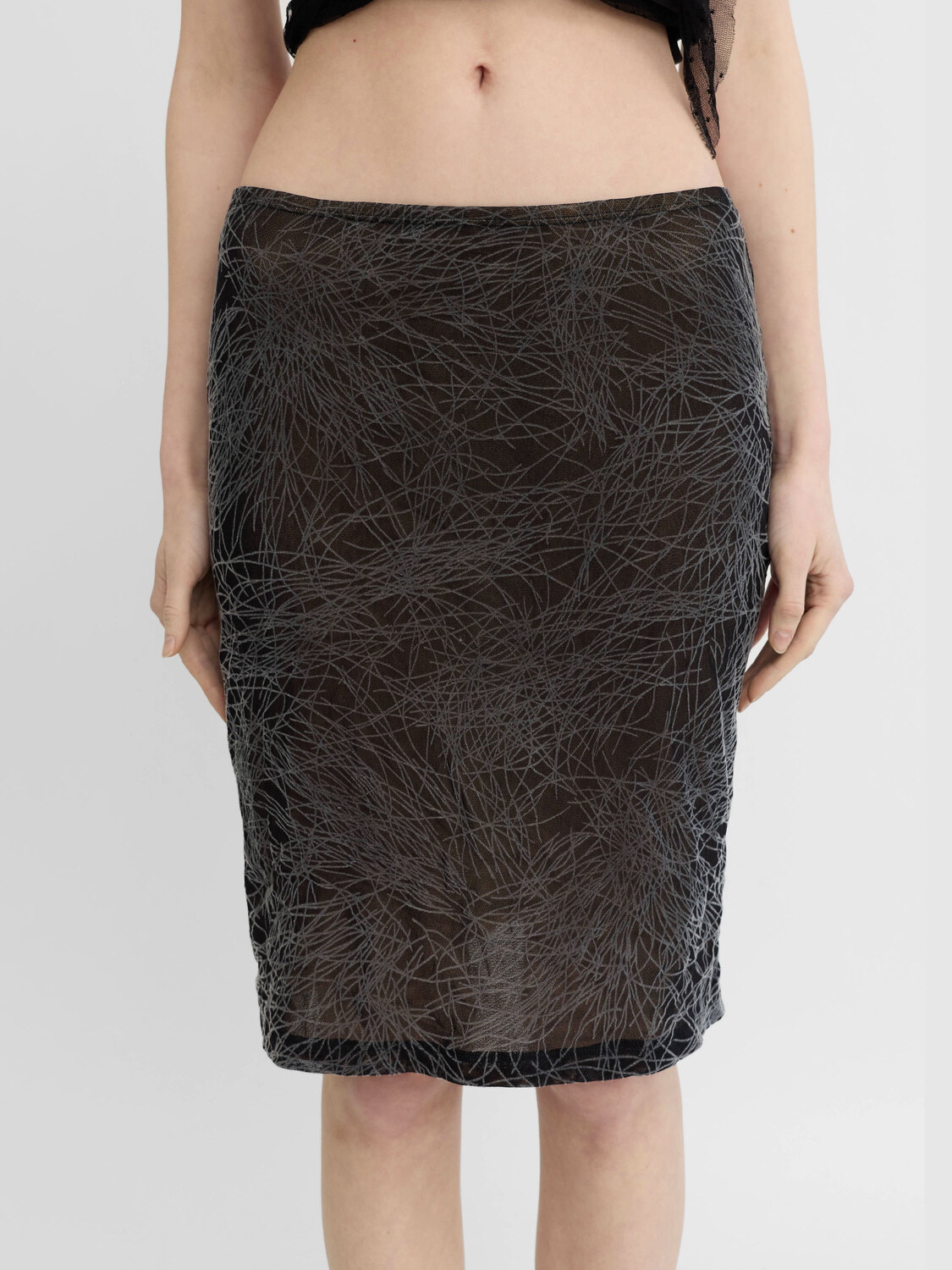 Future Ozbek by Rifat Ozbek stretchy black mesh midi skirt with a grey velvet graphic print. Lined with beige material.
