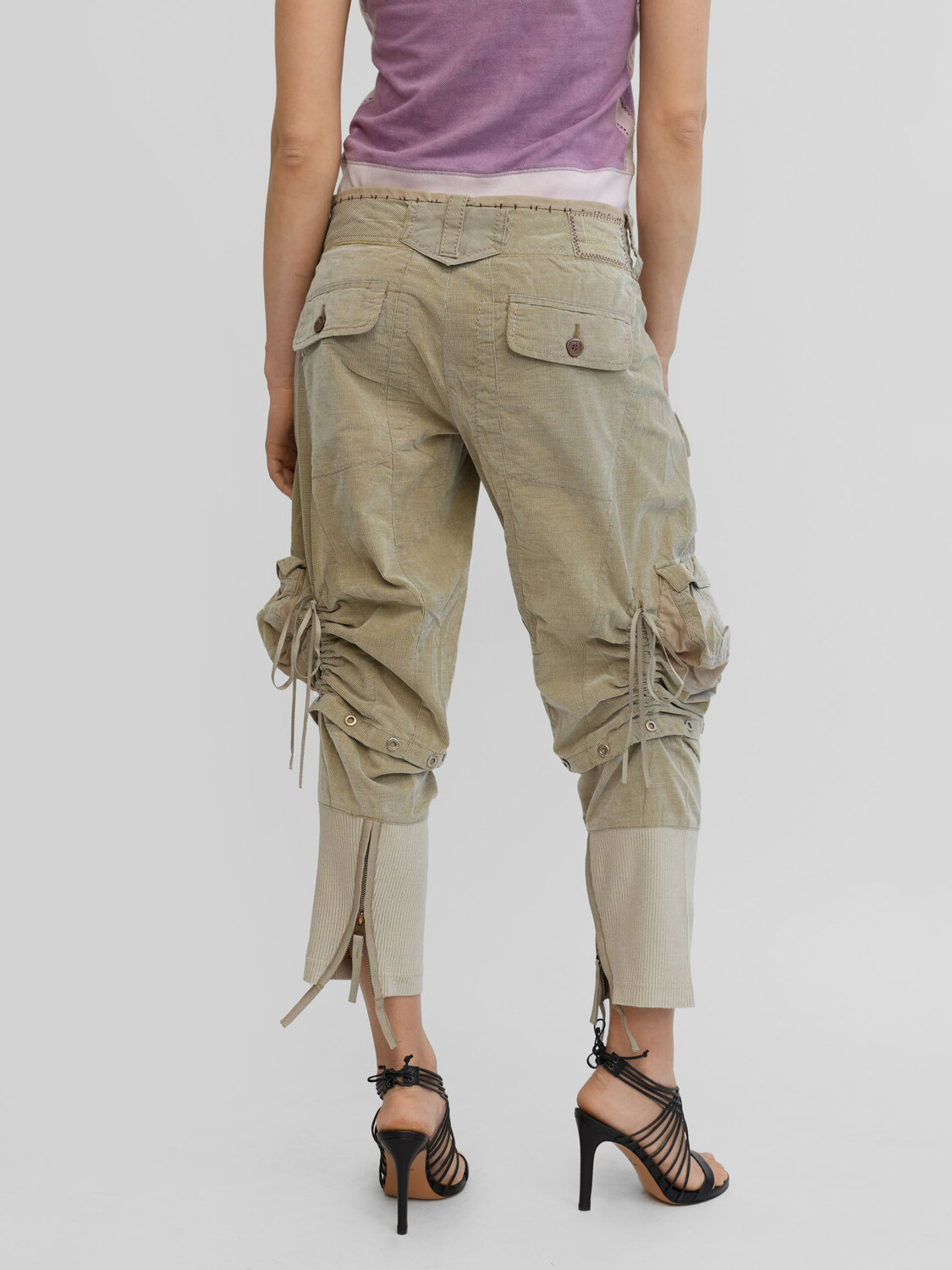 Marithé+François Girbaud khaki fine wrinkled effect velvet cargo capris with multiple front and rear pockets, gathered details, zip-adjustable rib-knit hems. Removable bottom sections for a shorter length.