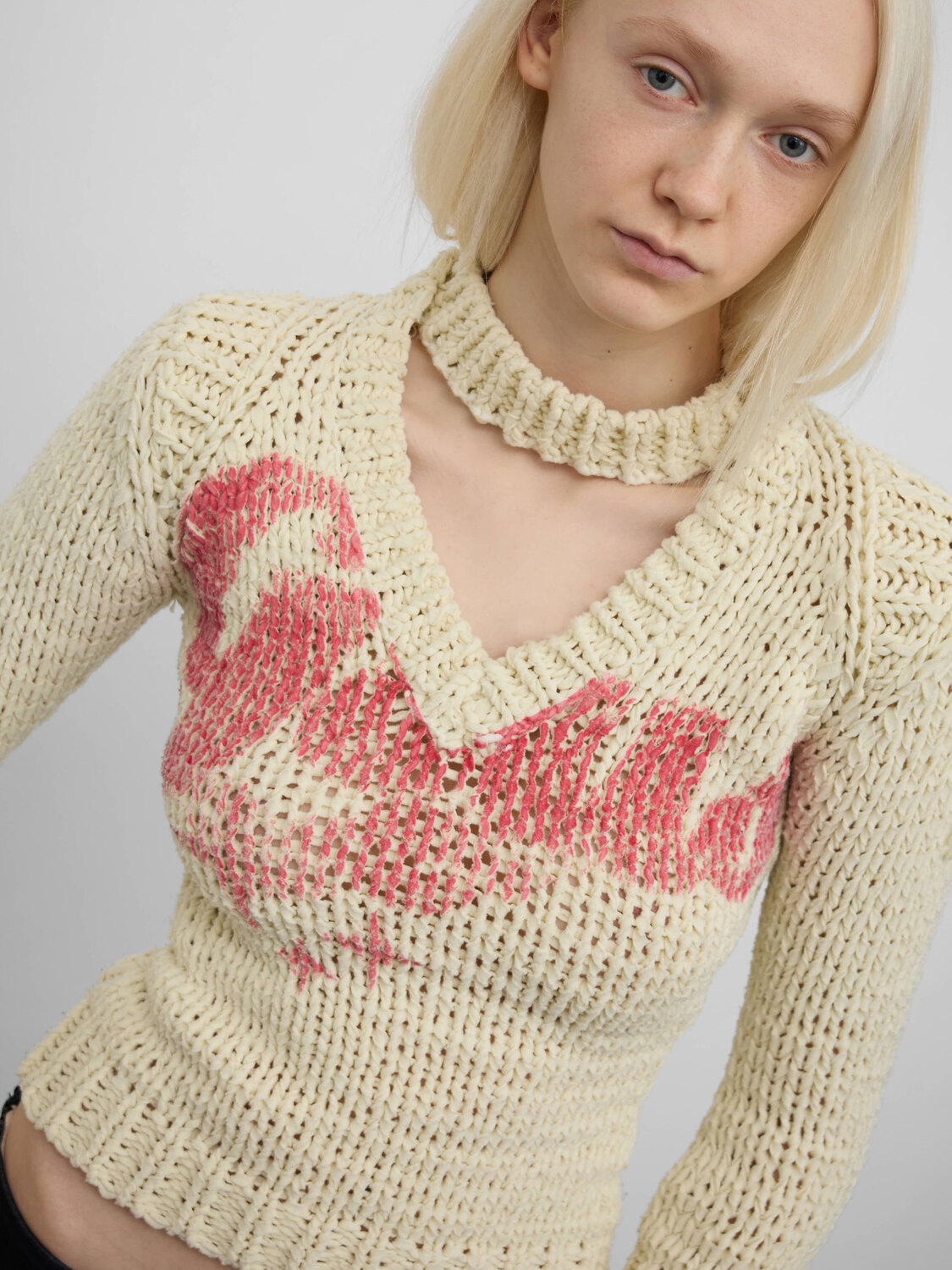 Gsus cream cable-knit jumper with a pink logo print.