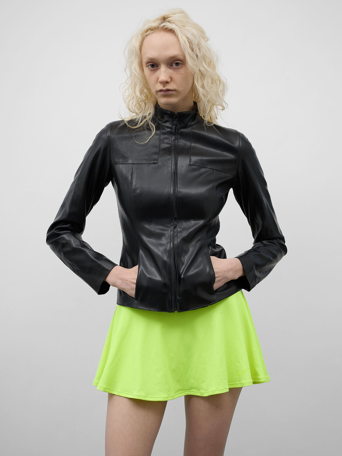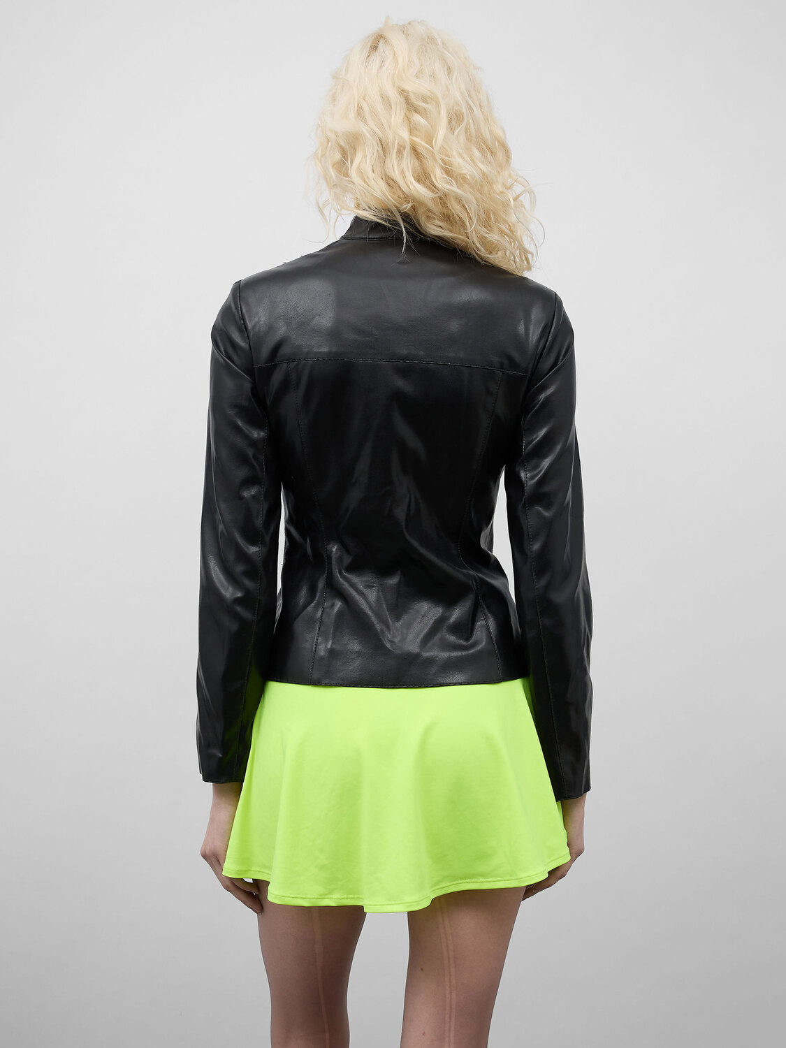 KOOKAÏ shiny black imitation leather zip-up jacket with small side pockets.