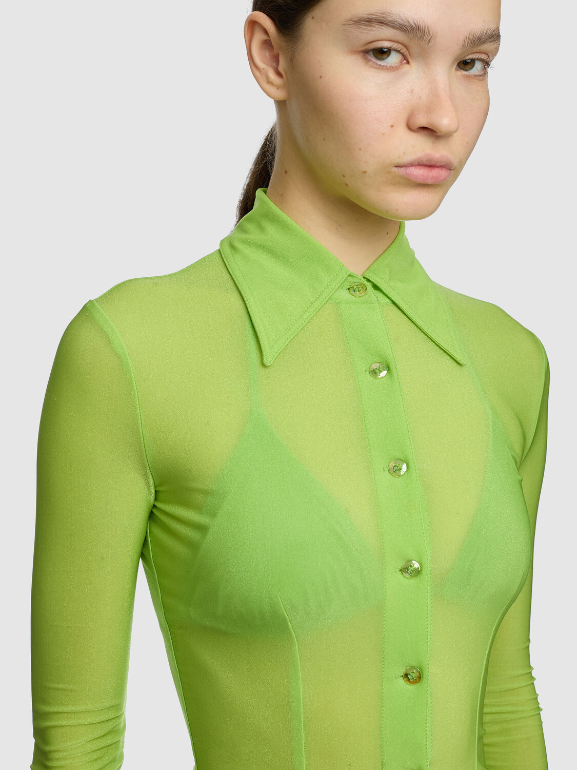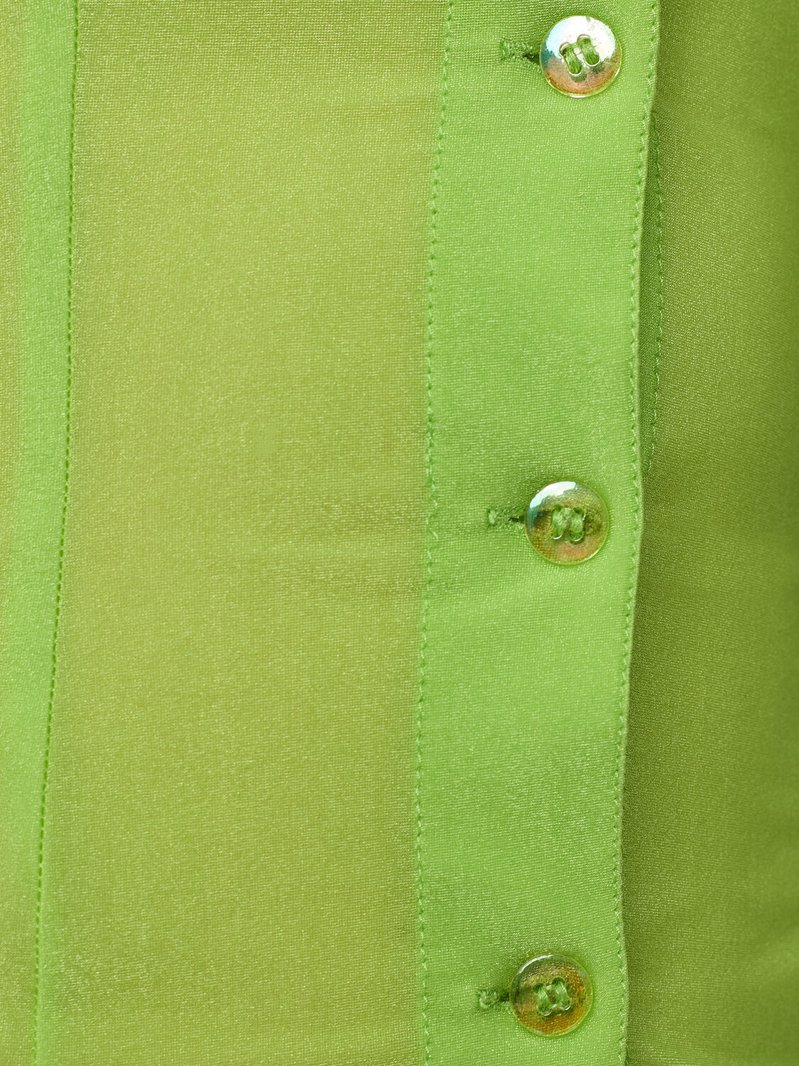 Lime green slightly shiny mesh fitted shirt, featuring holographic effect buttons.
