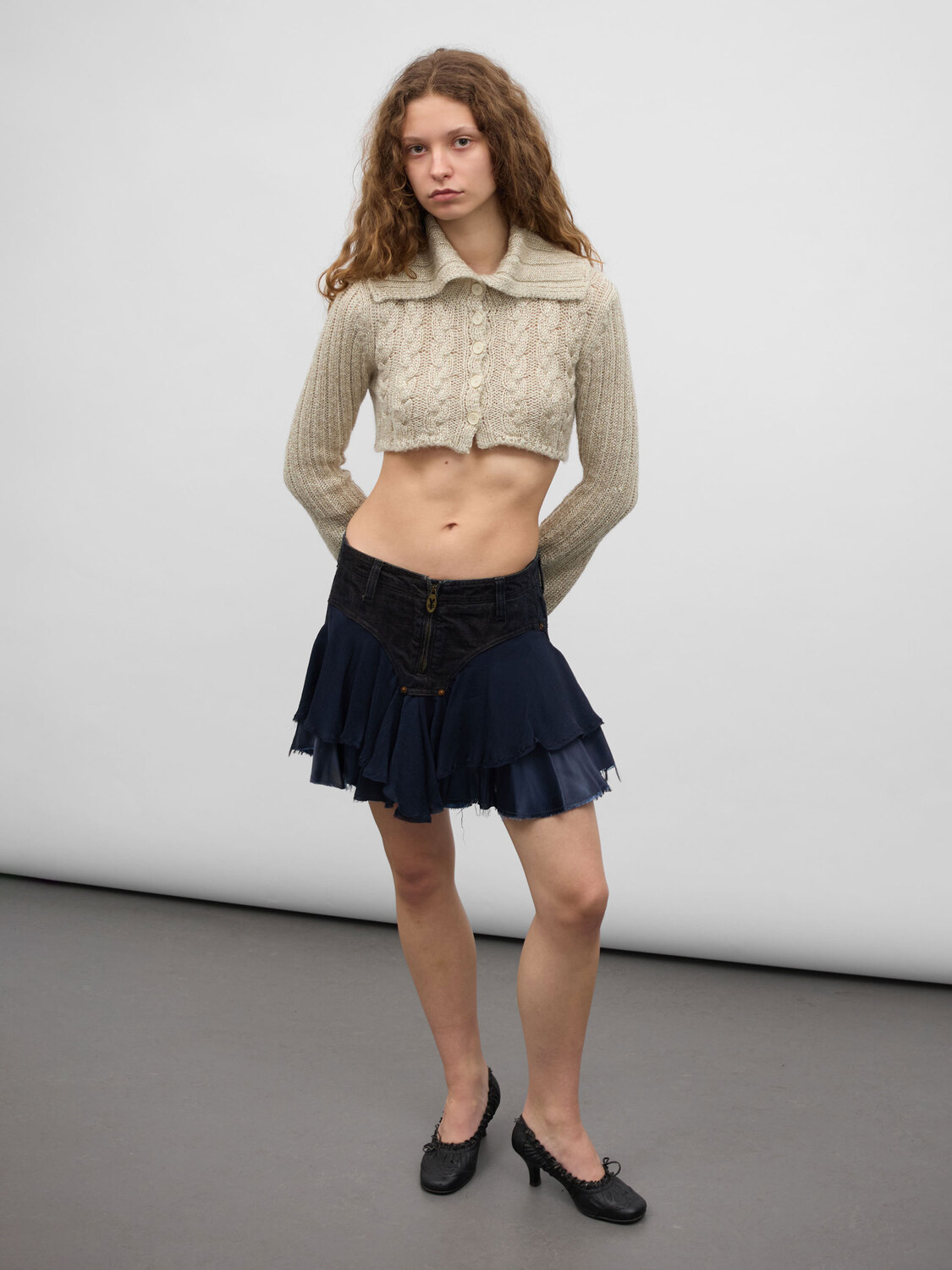 Michiko Koshino (Yen Jeans) deconstructed mini skirt in black denim, navy blue chiffon and satin. Pleated hem. Zipper closure at the front.