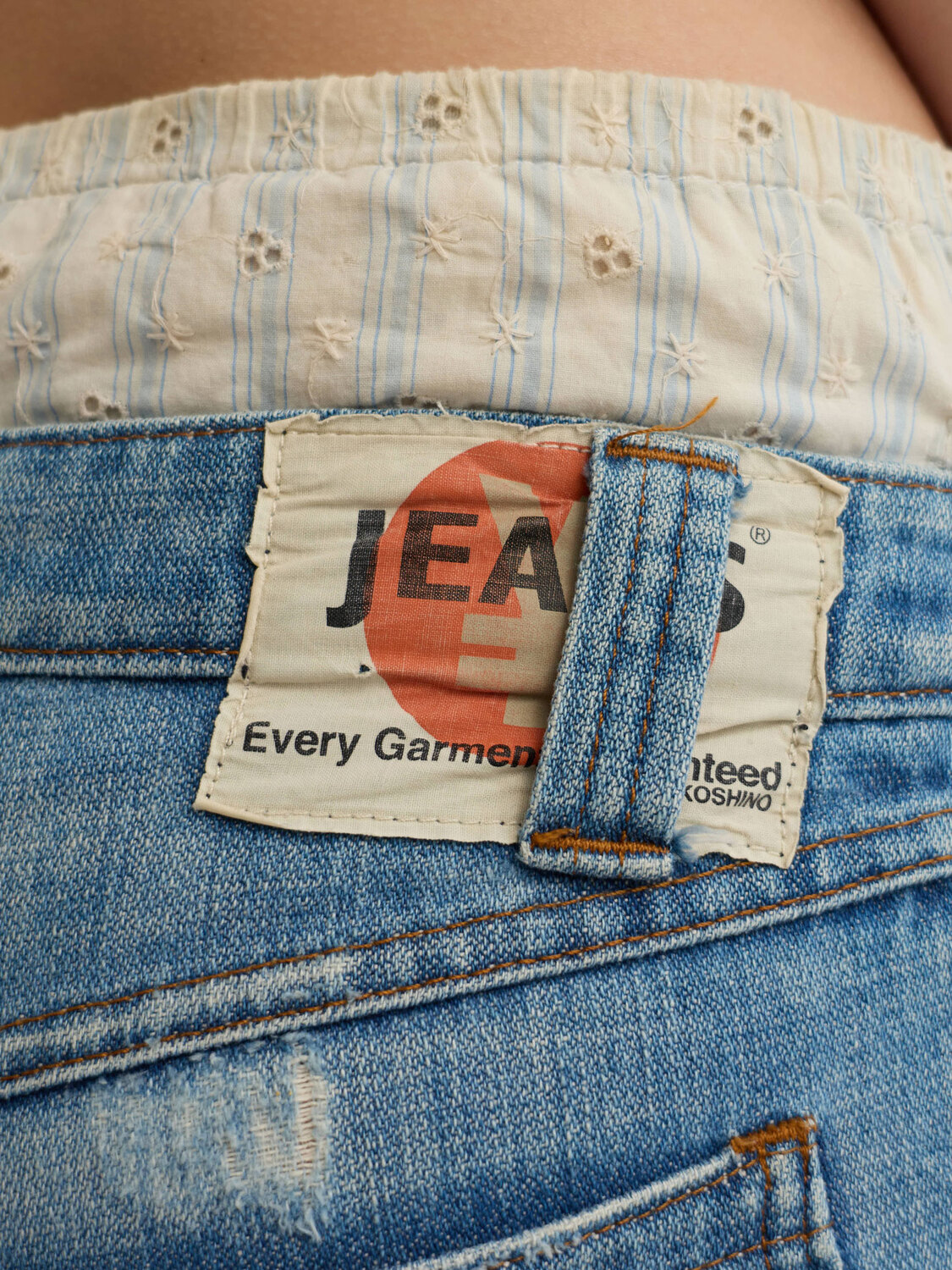 Michiko Koshino distressed effect double waist shorts in blue denim and off white embroidered lightweight cotton.