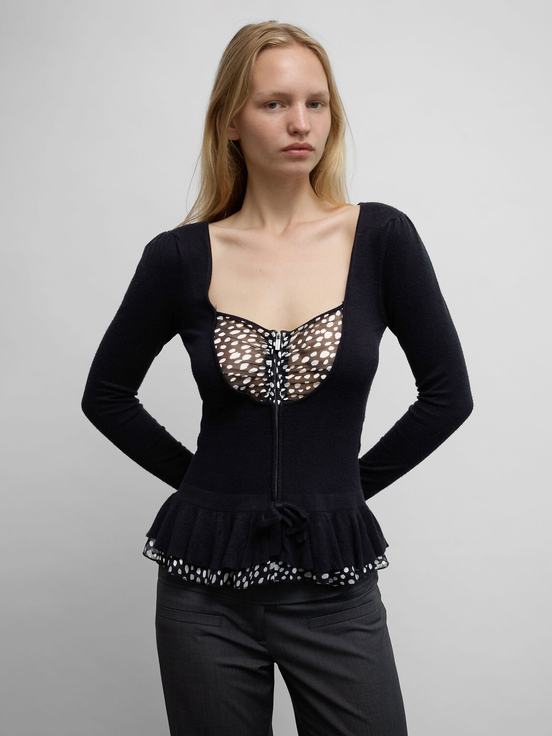 Morgan De Toi black fine knit zipped jumper with a polka dot chiffon trim and ruffled cuffs.