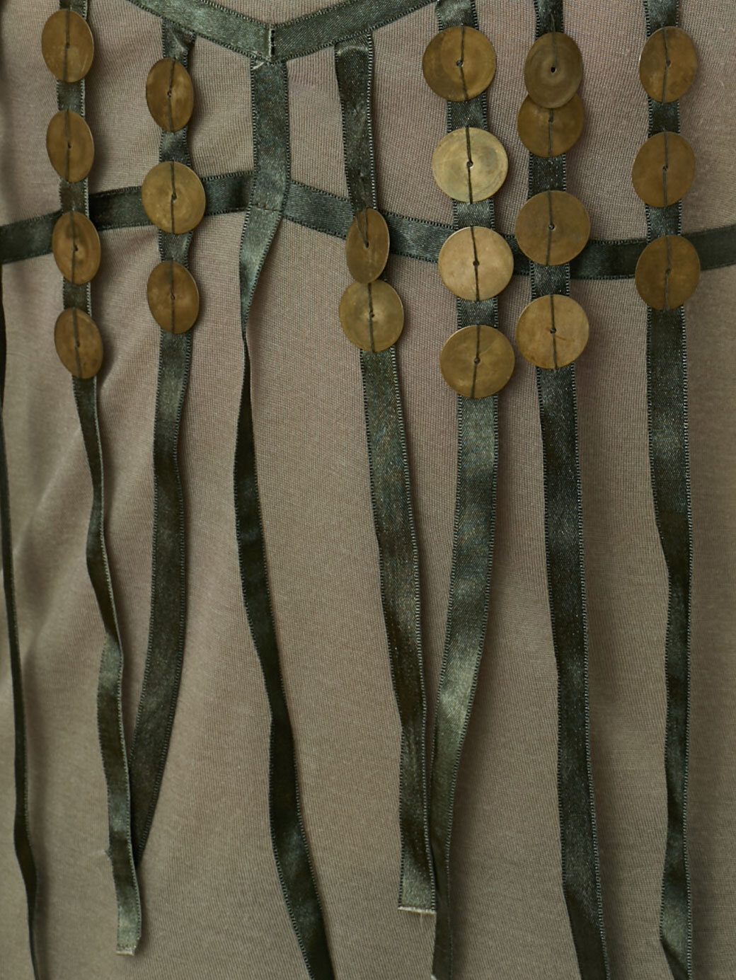 Nolita grey camisole top with green satin ribbon details and brass-tone metal buttons.
