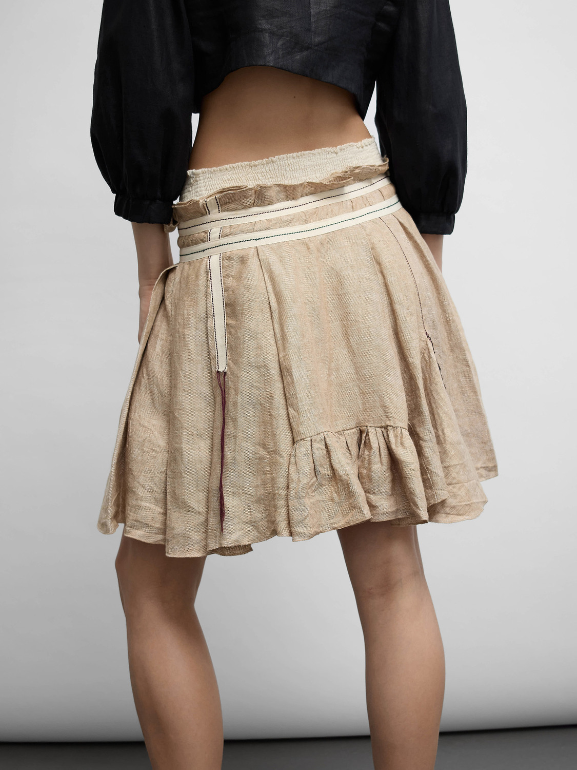 Beige canvas pleated wraparound mini skirt with ties and a cream broderie anglaise underlayer for a double waist effect.