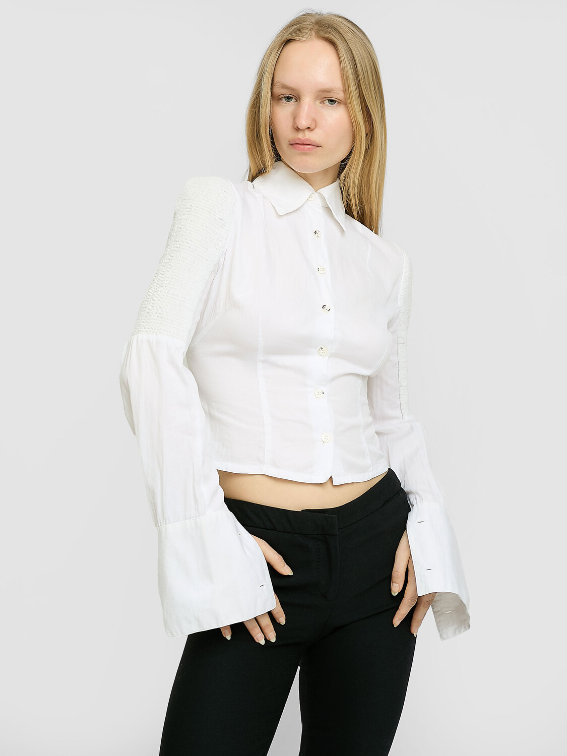 Plein Sud white button-up shirt with gathered mesh upper arm inserts.