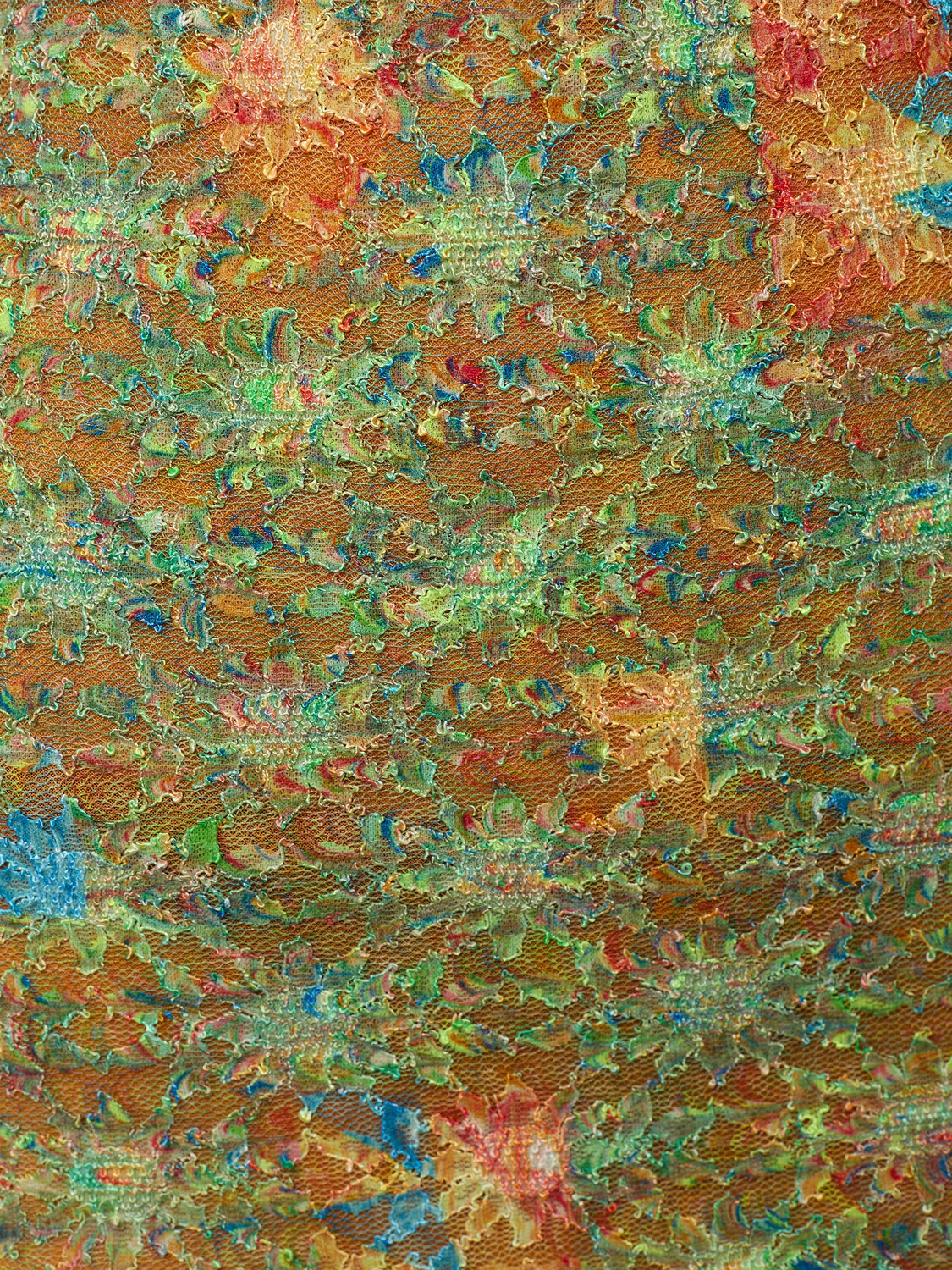 Plein Sud (Sun Line) multicolor stretchy lace mini dress featuring greige trim, spaghetti straps and sheer orange mesh lining.