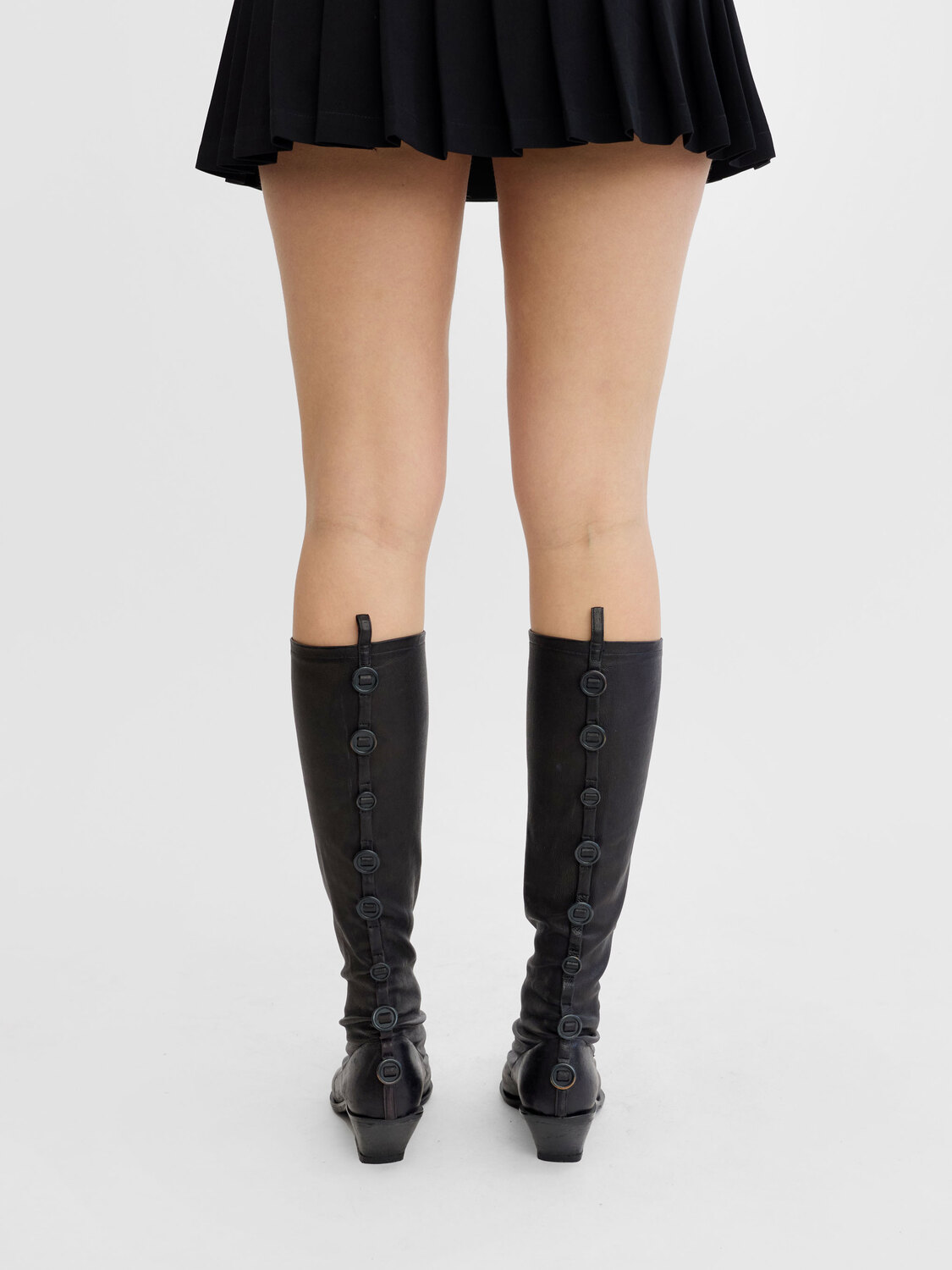 Plein Sud black leather pointed-toe knee-high boots. Decorative buttons at the back.