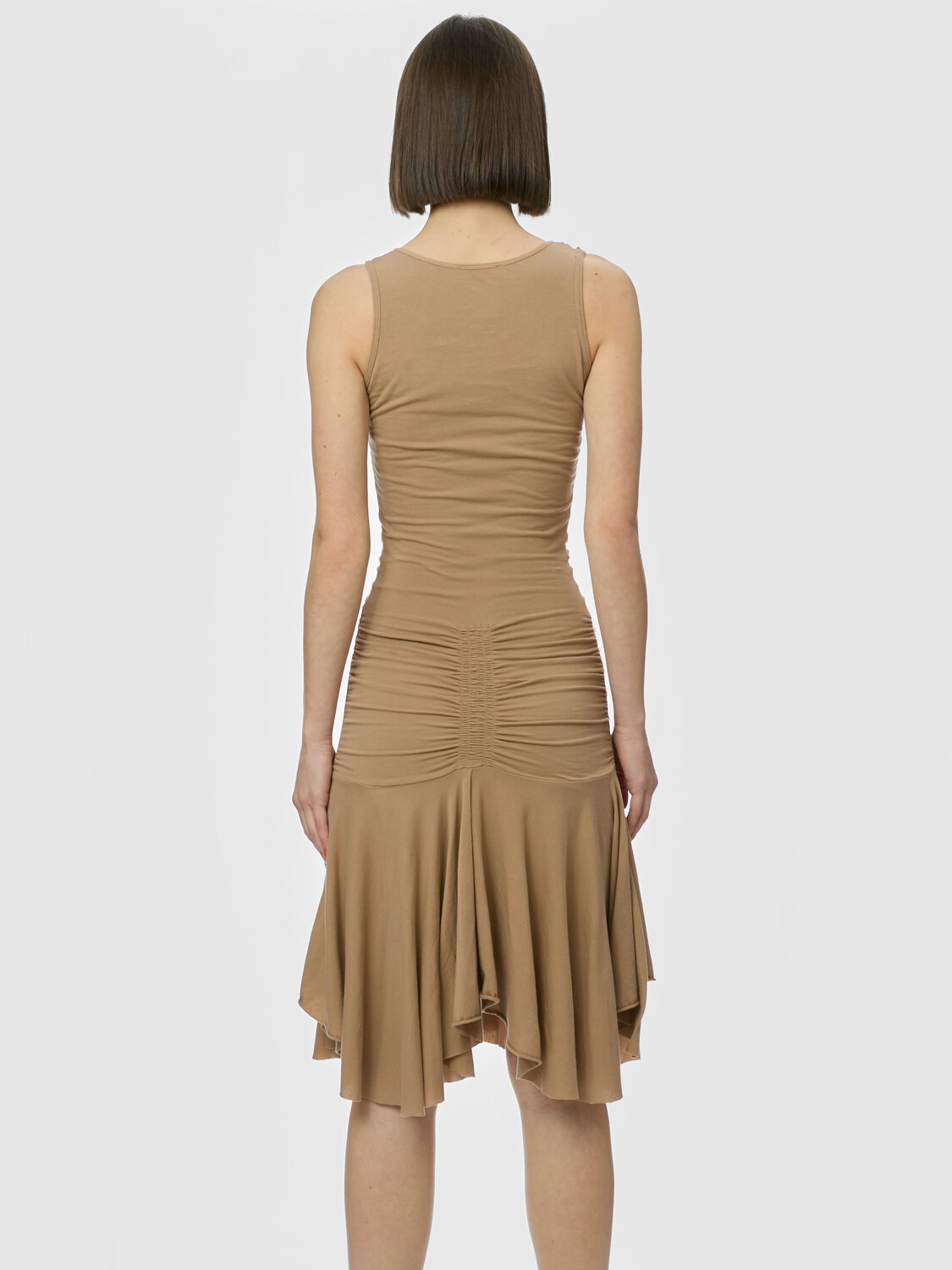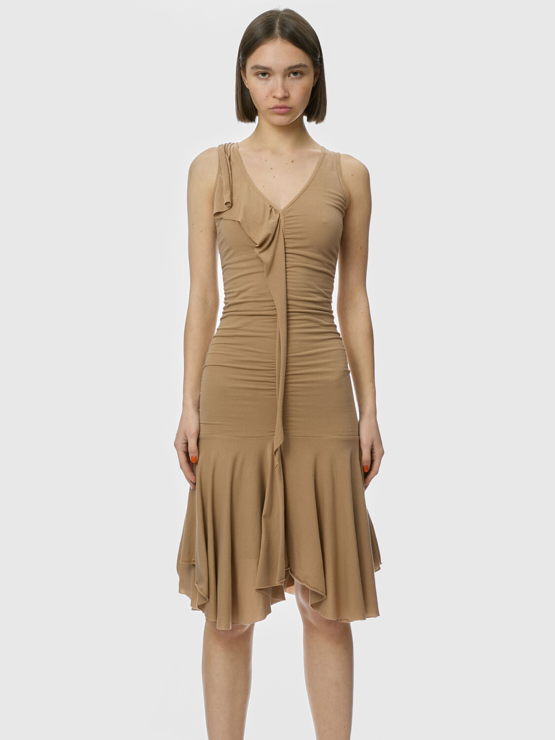 Plein Sud deep taupe stretchy sleeveless maxi dress with a raw finish, gathered details on the sides and in the middle, a pleated skirt with multiple splits and an asymmetrical flounce detail.