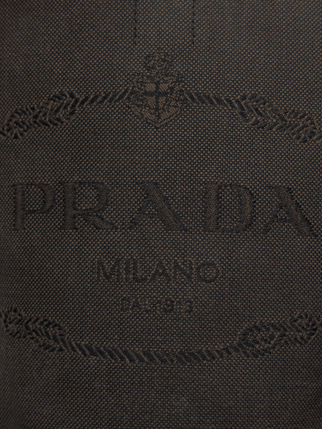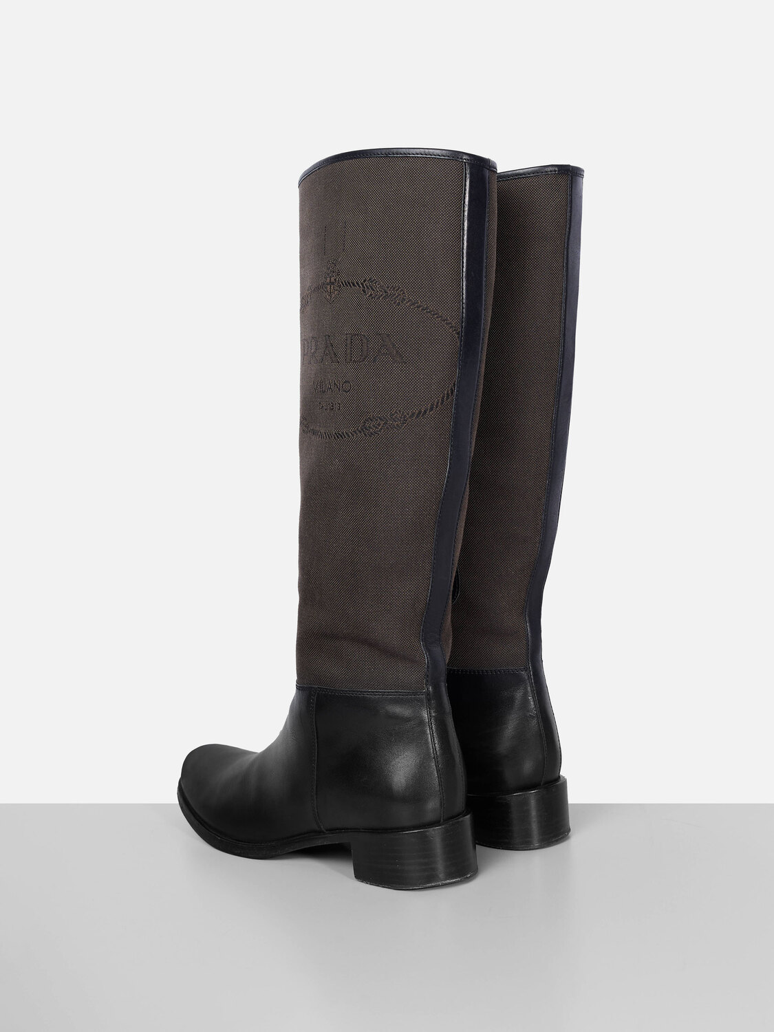Prada round toe knee-high boots in black leather and greyish brown canvas. Jacquard logo on the sides. Zipper closure.
