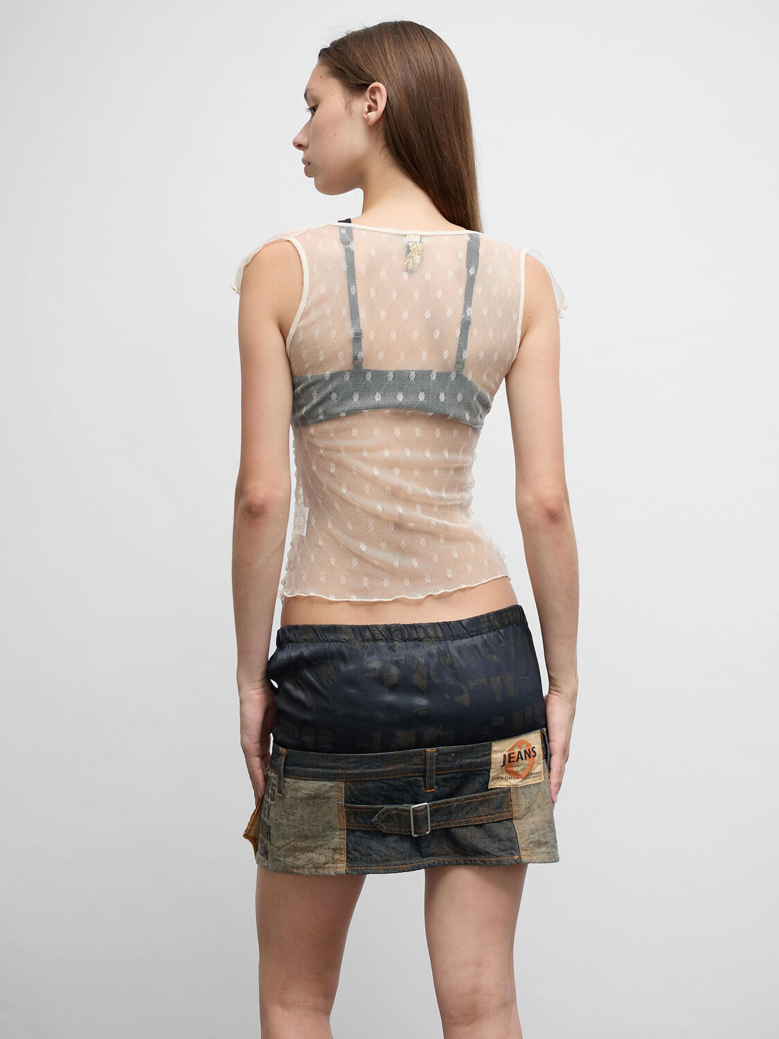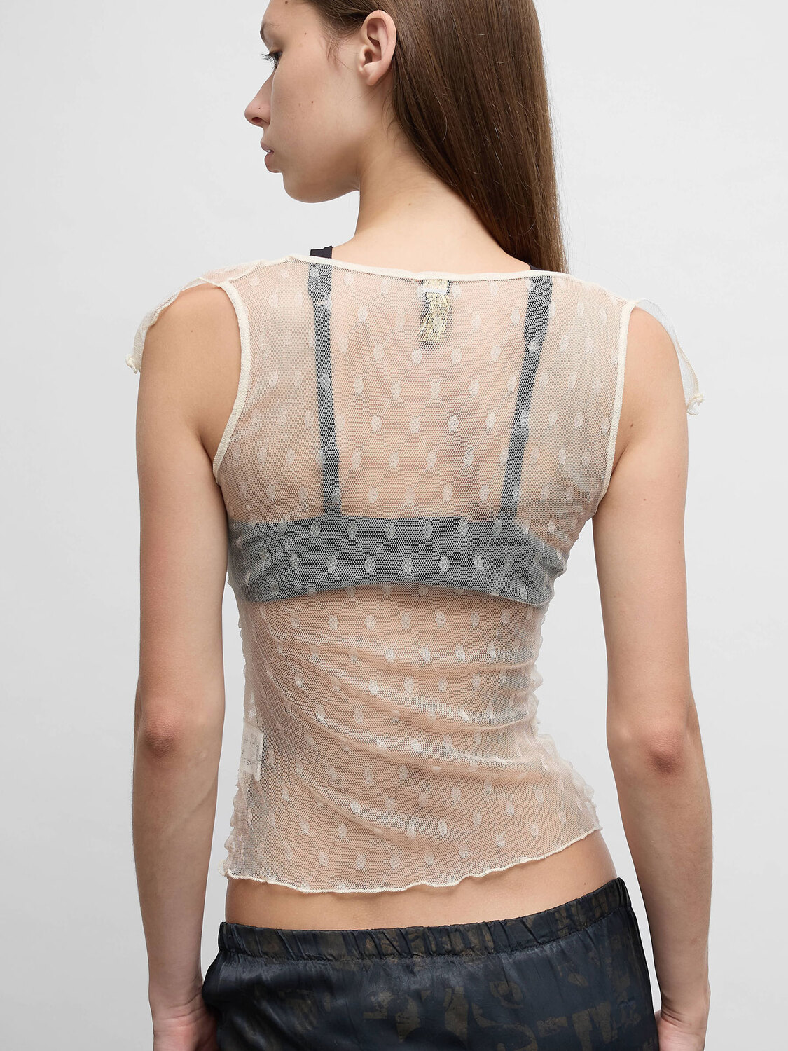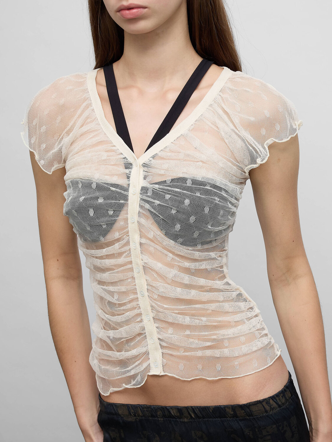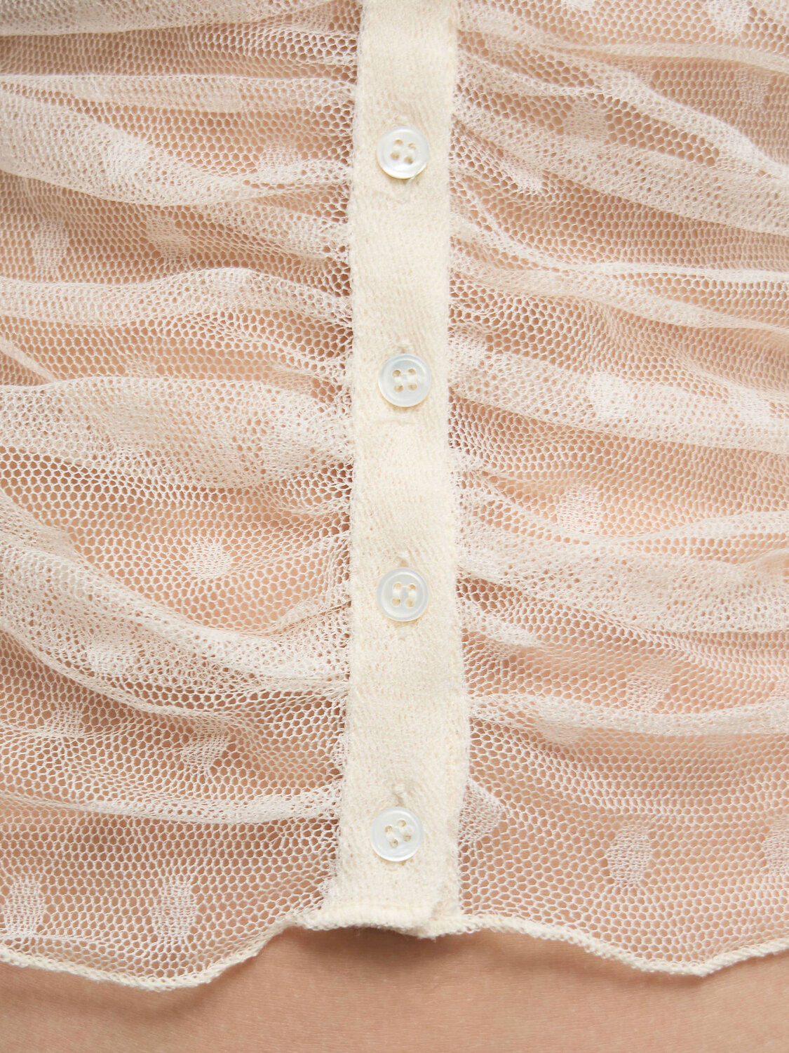 Off white sheer silk mesh polka dot sleeveless cardigan with gathered effect and button-up closure.