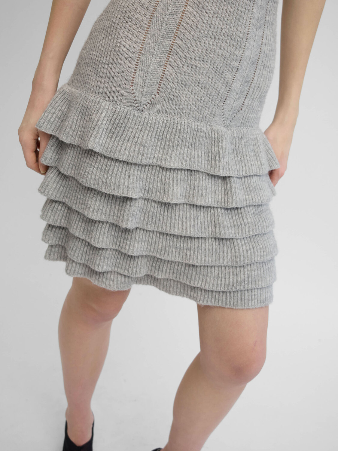 Sisley grey knitted camisole dress with spaghetti straps and layered ruffled skirt.