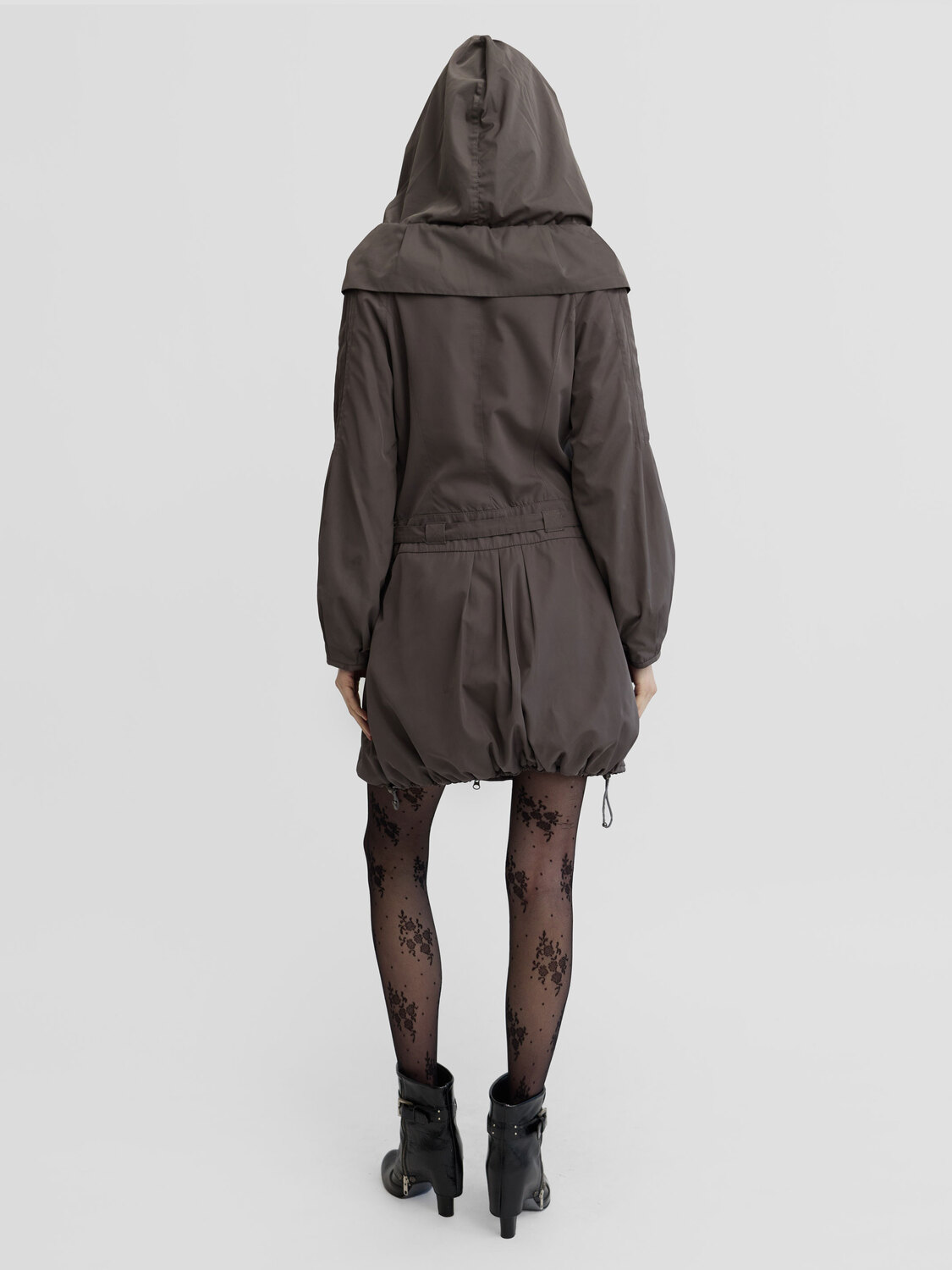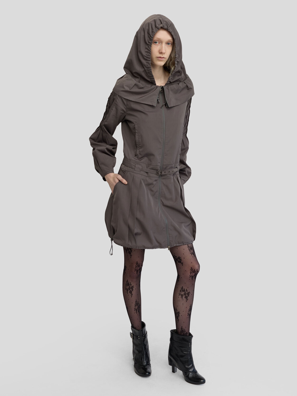 Cop Copine gray zip-up coat Drawstring with pleated details, adjustable hood and hem, multiple pockets and an integrated belt. Fold-over detail at the collar.