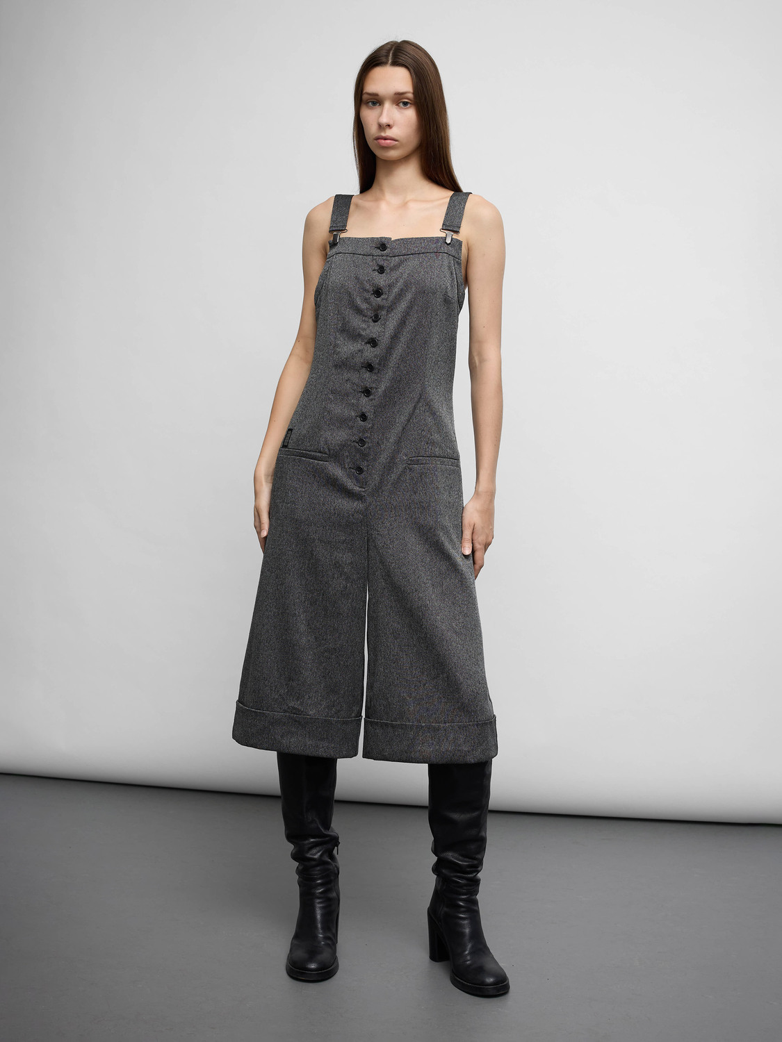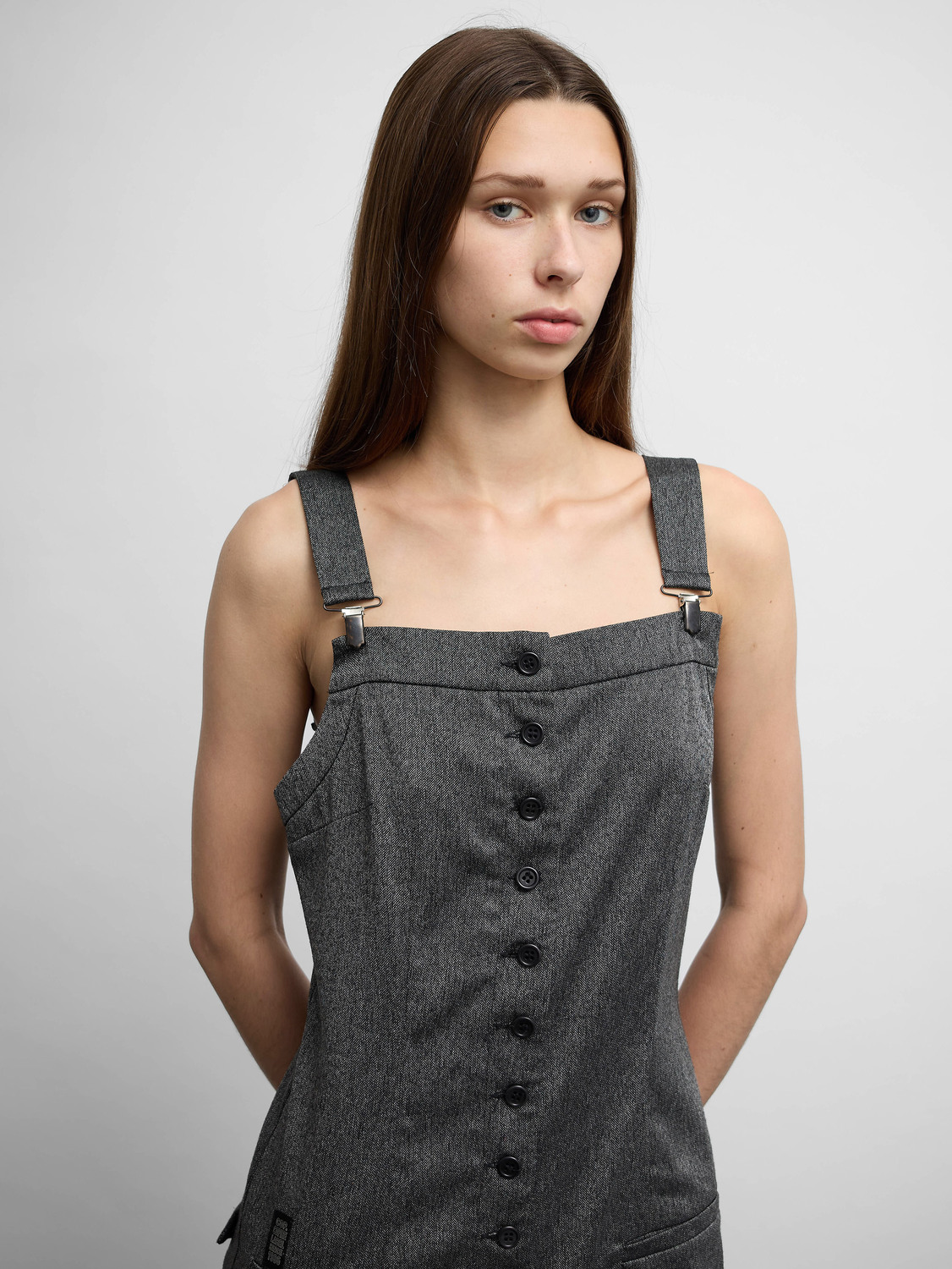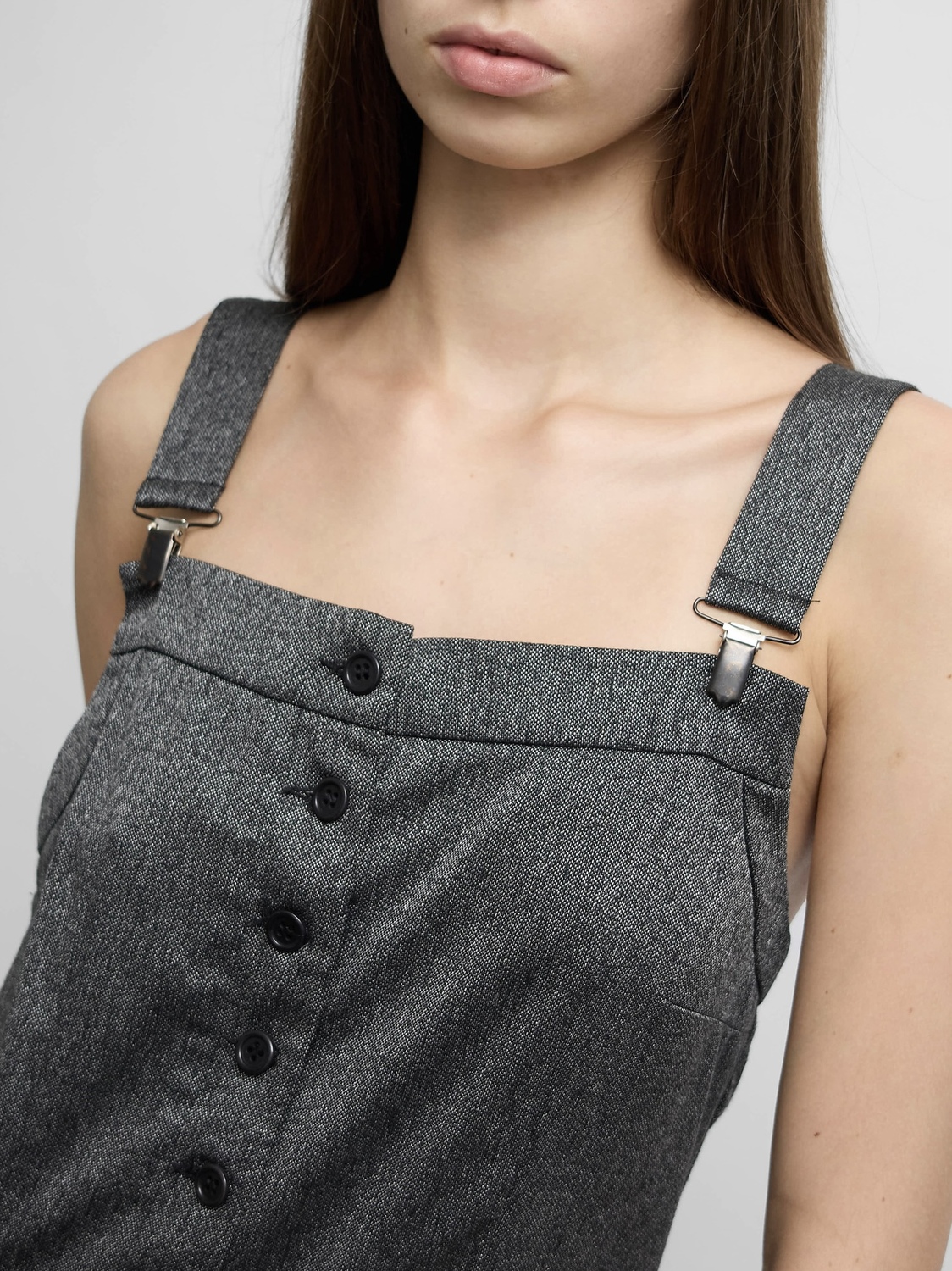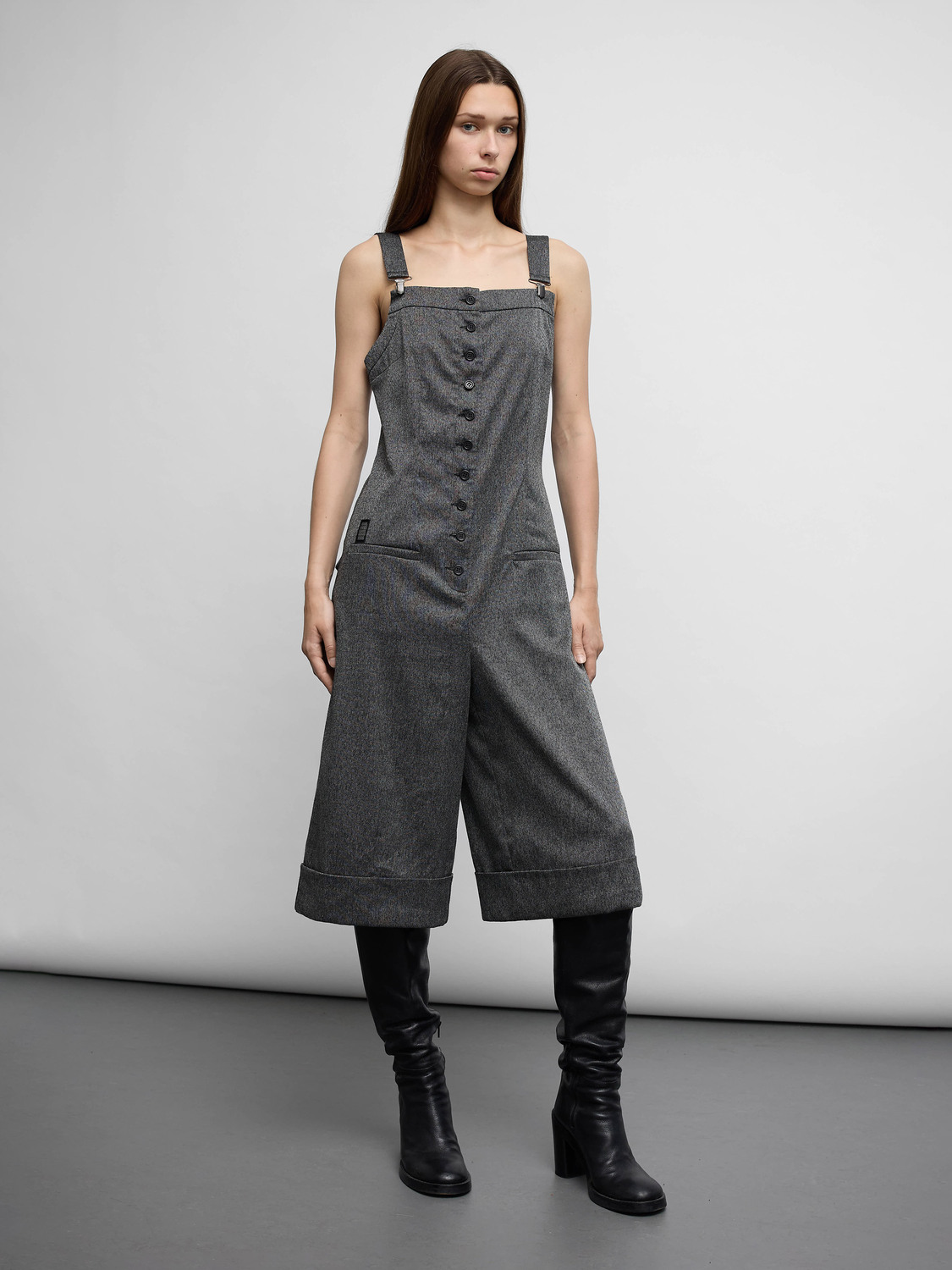 Cop Copine grey short dungarees with adjustable brace-style shoulder straps and pockets.