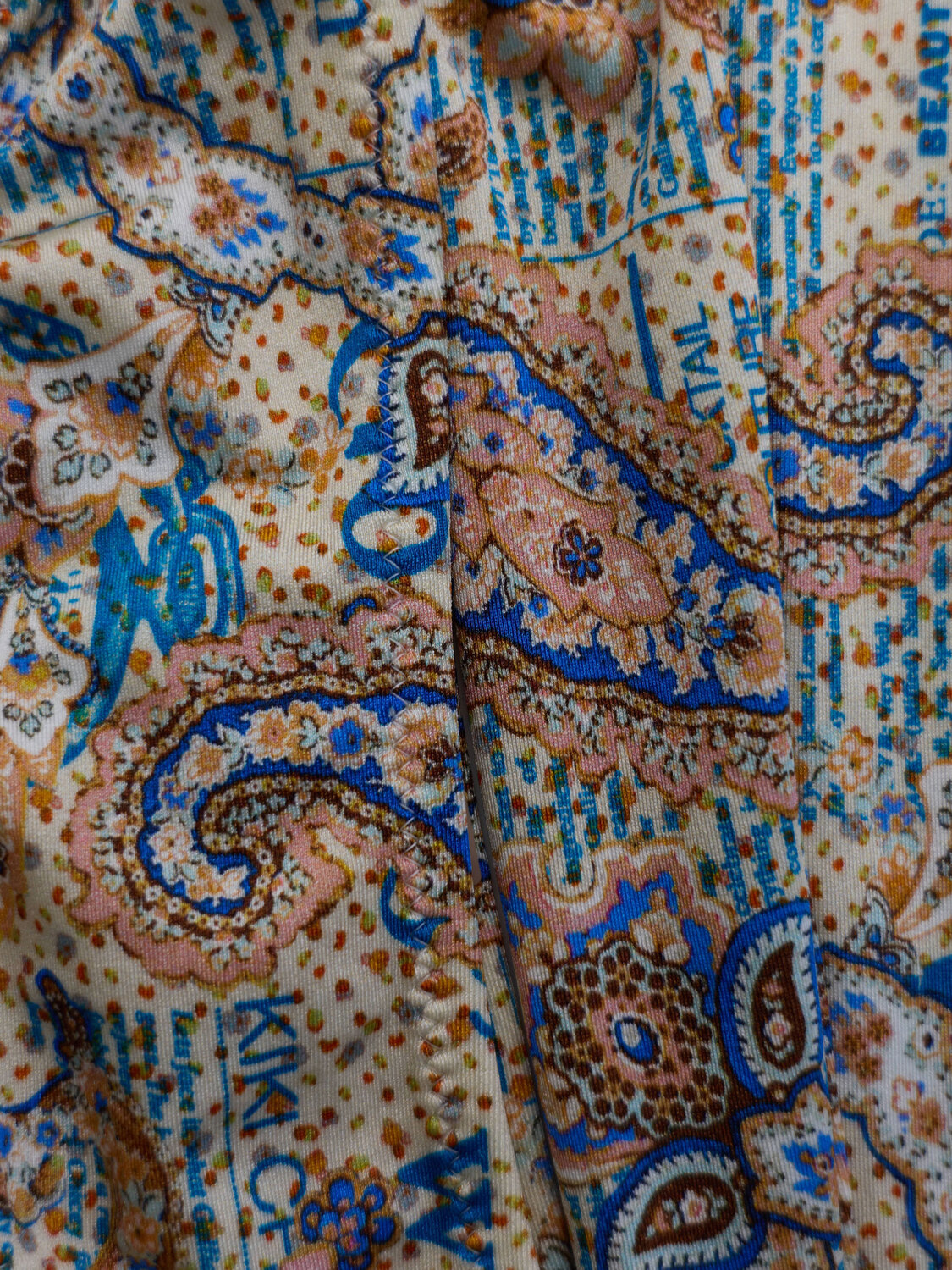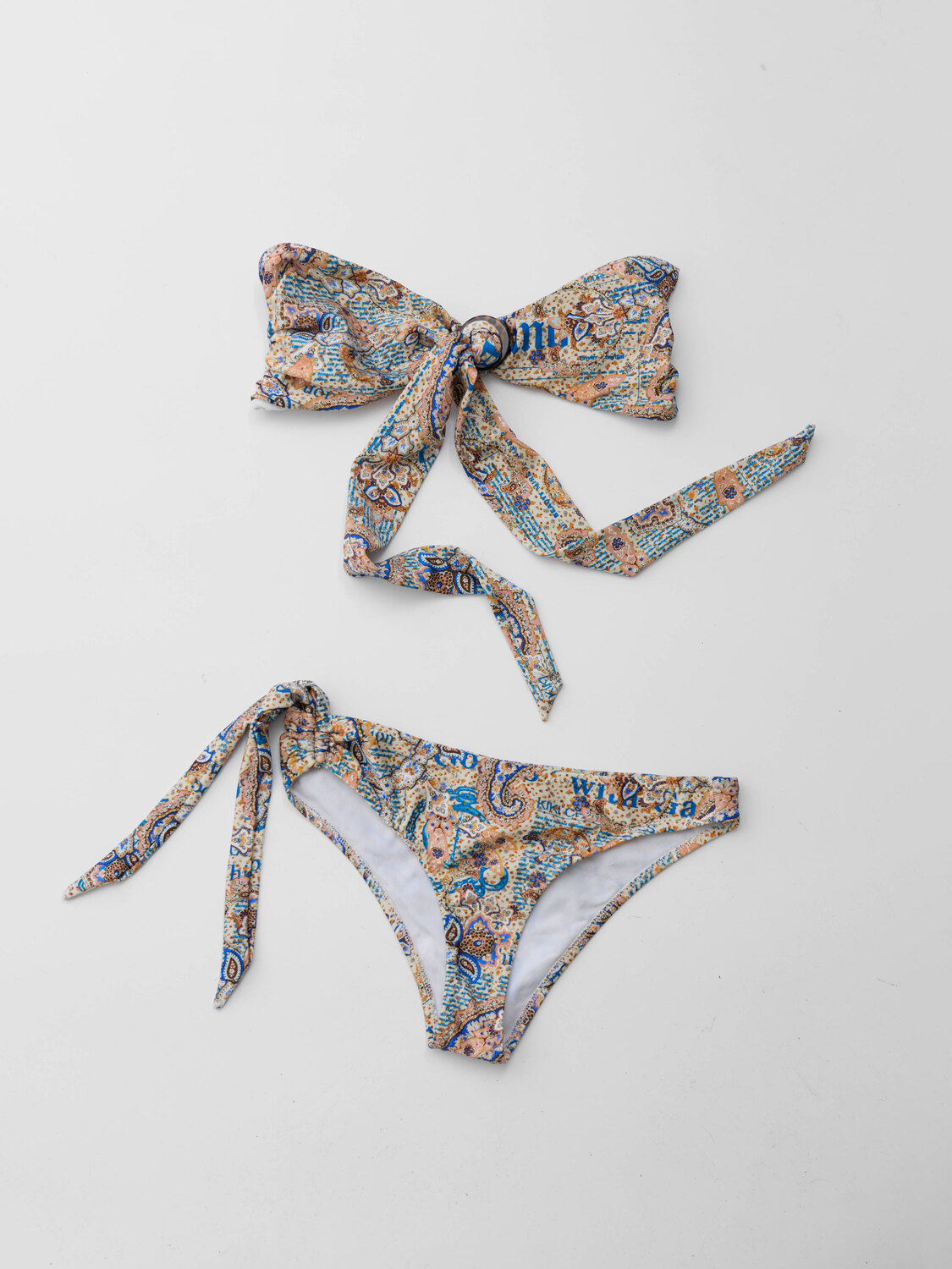 Galliano multicoloured bikini set condition of bikini briefs with ties on one side and strapless top with gathered details and ties. Featuring a paisley/gazette print.